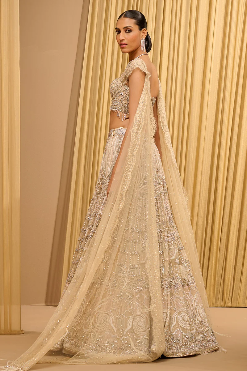 An art nouveau-inspired nude lehenga beautifully brought to life with intricate embroidery, shimmering sequins, delicate beads, and sparkling Swarovski crystals. Paired with a matching embellished corset featuring graceful lace wings, this ensemble blends timeless elegance with a touch of modern allure.