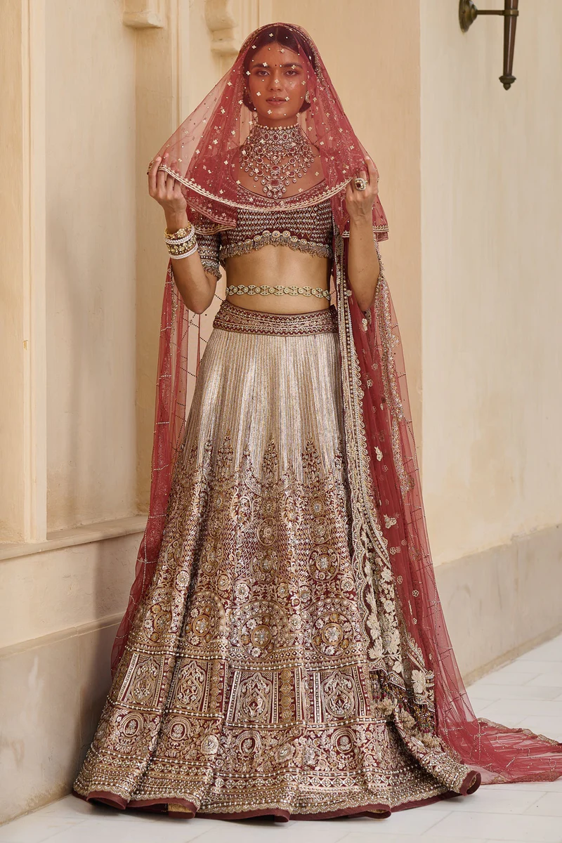 A masterpiece of opulence and craftsmanship, this Bidri work–inspired bridal lehenga dazzles with intricate hand embroidery in zari, resham, dabka, jewelled stones, and pearls. Paired with an encrusted blouse, an embroidered dupatta, and a crystalised veil, it evokes regal grandeur in rich wine silk dupion and Indian tulle—crafted to make every bride shine with timeless grace.