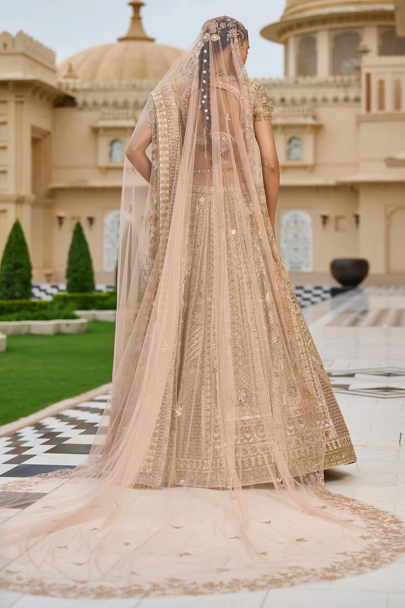 Step into timeless grandeur with this Hand-Embroidered Kalidar Lehenga, a true masterpiece that captures the opulence of a bygone era. Every inch of this creation is a celebration of artistry — adorned with dazzling crystals, shimmering sequins, intricate zardozi, fine dabka, and delicate beads that come together in a mesmerizing symphony of craftsmanship.