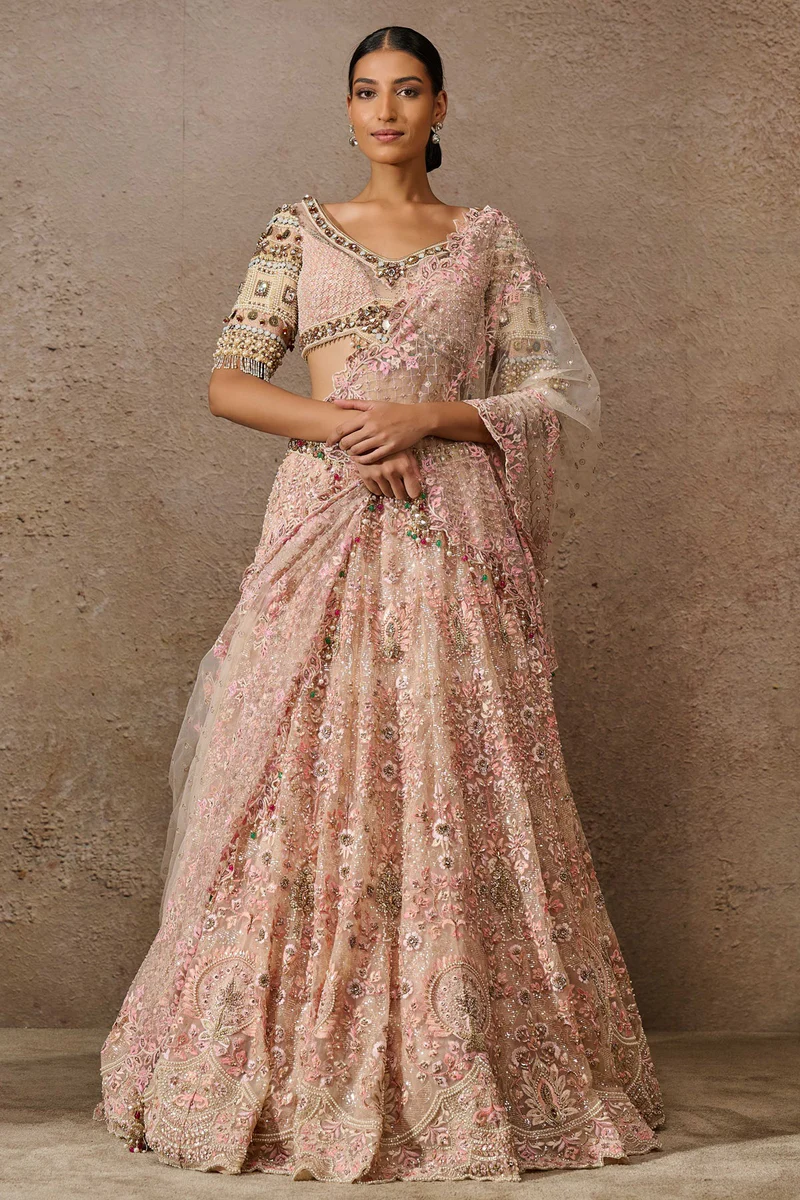A dreamy blush tulle lehenga that exudes timeless charm, beautifully detailed with intricate embroidery and paired with a crystal-embroidered blouse. The look is completed with a delicate tulle dupatta featuring fine embroidery and soft fringe detailing — perfect for making every moment feel effortlessly elegant.