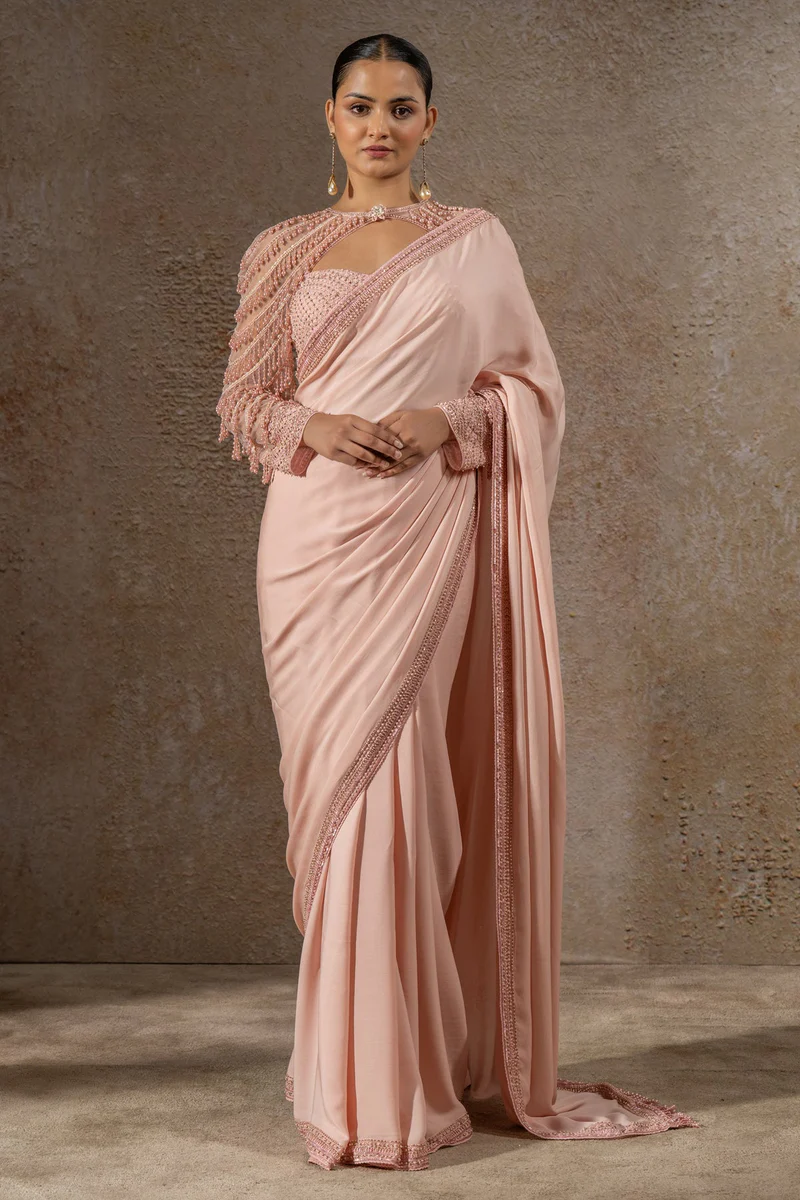 A timeless classic, this blush georgette saree features a beautifully embroidered border that adds just the right touch of elegance. Paired with a pearl-embroidered blouse crafted from soft tulle net, it’s the perfect blend of grace and sophistication.