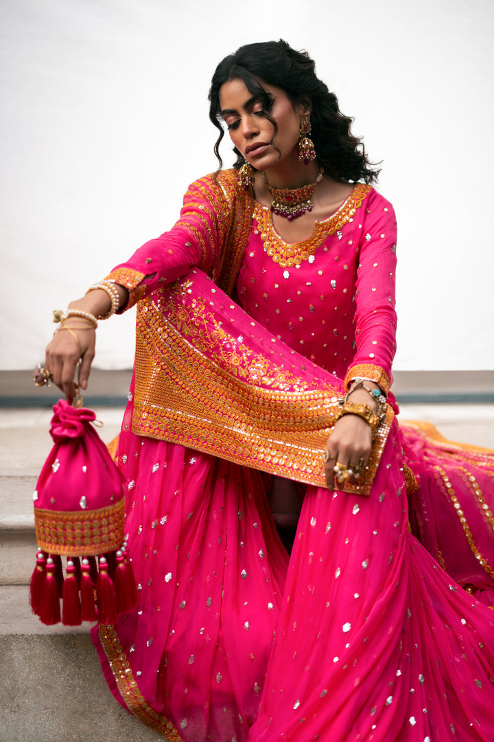A crinkled chiffon shirt of medium length featuring intricate embroidery along its borders and neckline, embellished with sequins sprinkled throughout. Paired with a Gharara made of Pakistani raw silk lining and a bostiar, complemented by a crinkle chiffon dupatta adorned with embroidered borders on all sides.