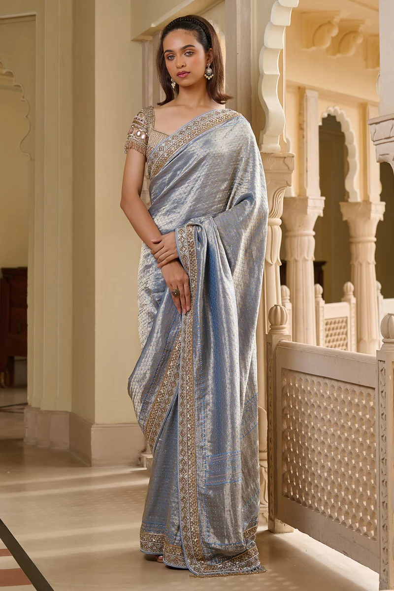 A stunning Banarasi saree in elegant pearl blue, beautifully detailed with shimmering crystals, hand-embroidered sequins, and delicate Kundan borders. Paired with a perfectly matching embroidered blouse, this timeless ensemble blends traditional artistry with a touch of modern grace.