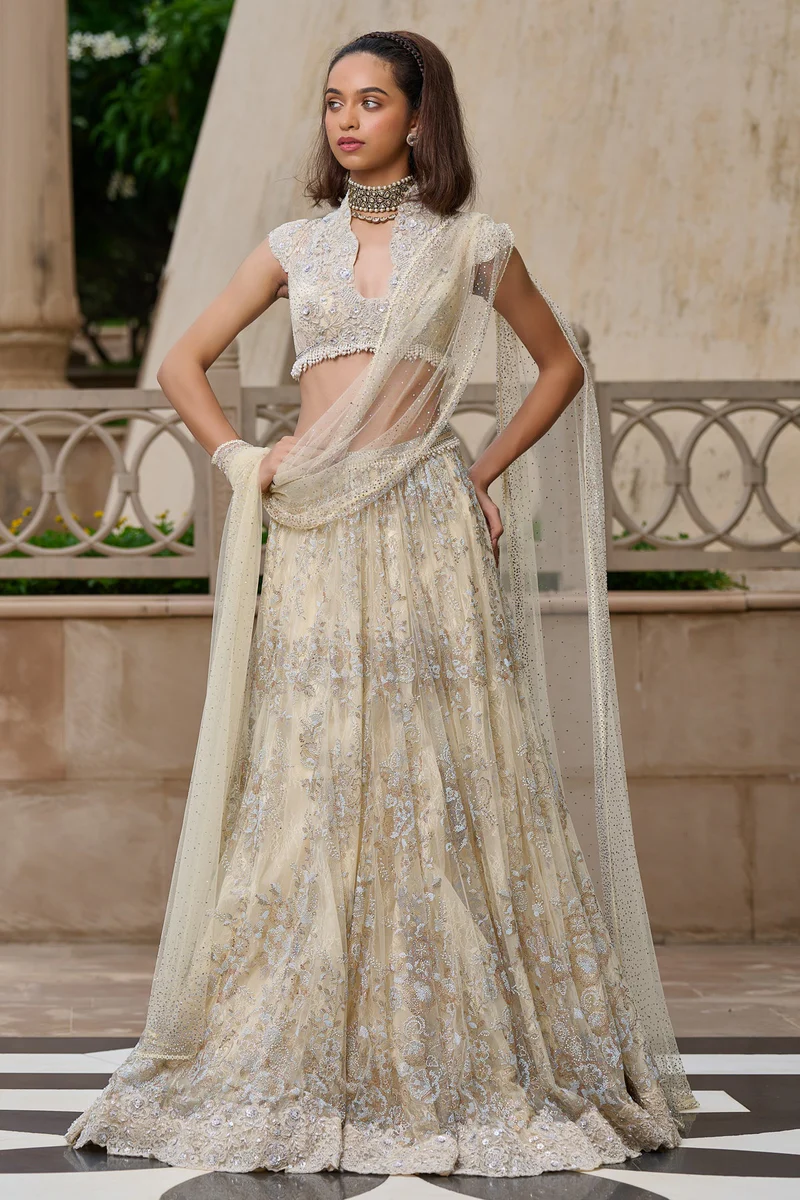 Radiating timeless charm and ethereal beauty, this Crystal Embellished Lehenga is a true masterpiece crafted to leave a lasting impression. The delicate tulle fabric forms a graceful canvas for intricate crystal and pearl embellishments, each shimmer reflecting pure sophistication.