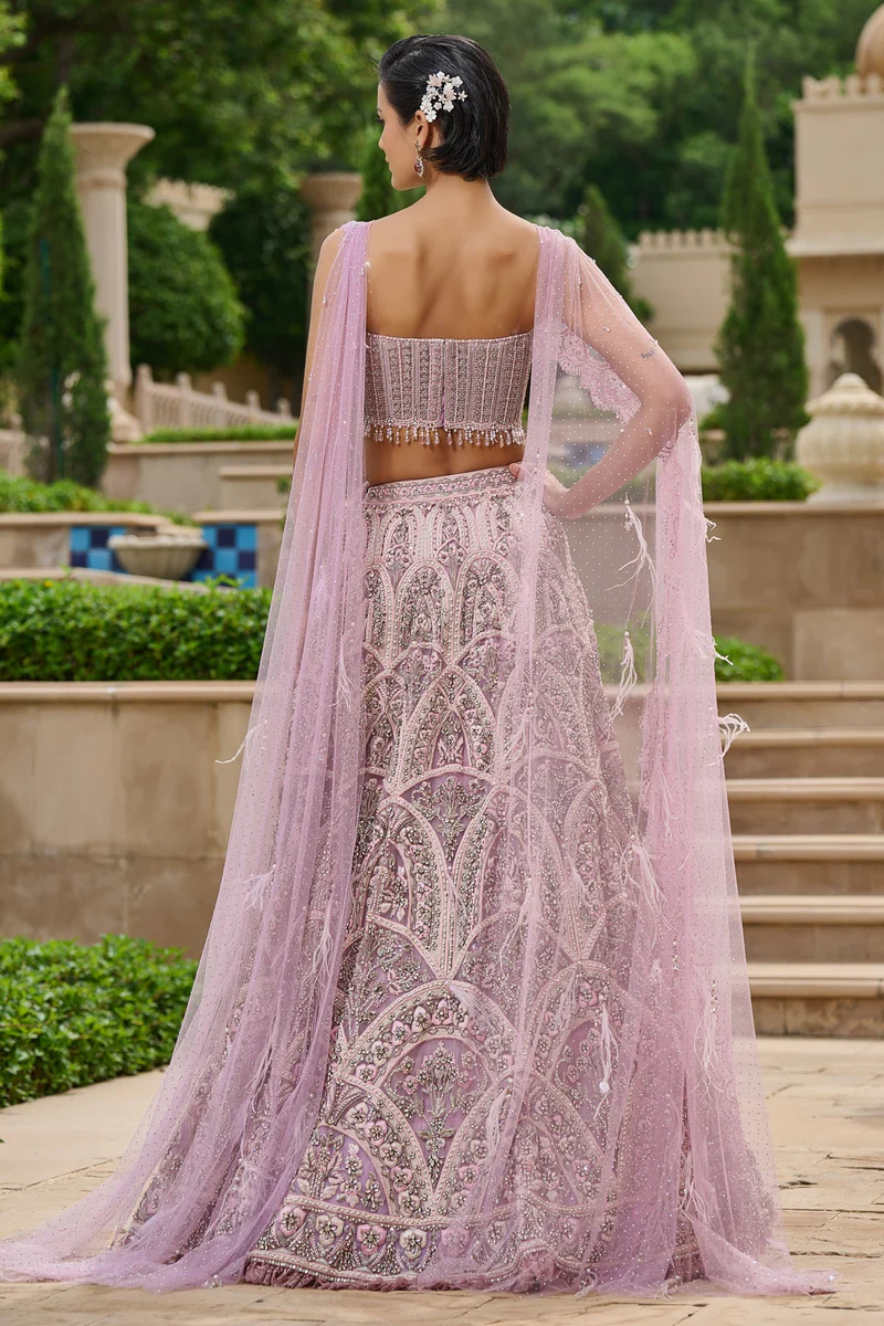 A breathtaking lilac masterpiece that captures the essence of modern royalty — this crystal and threadwork-embroidered lehenga shimmers with every movement, creating a dreamy play of light and texture. Paired with a jewel-encrusted corset blouse that exudes opulence, and structured drapes that lend an air of graceful sophistication, this ensemble is designed to make an unforgettable statement.
