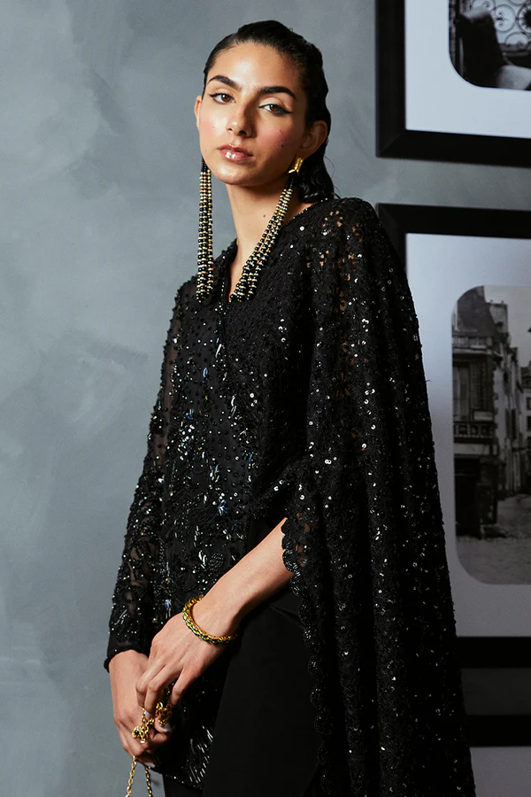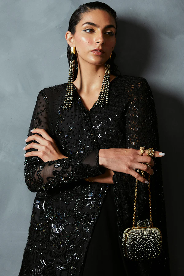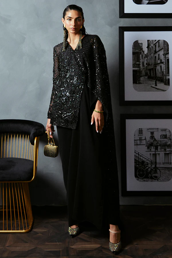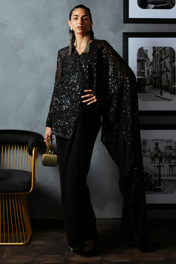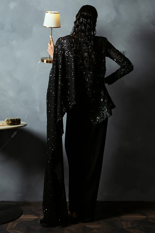 Step into the spotlight with this mesmerizing black, full-drape dress paired with cigarette pants — a statement of effortless sophistication and modern allure. The V-neck silhouette gracefully flatters the form, featuring a single fitted sleeve that contrasts beautifully with the veiled counterpart.