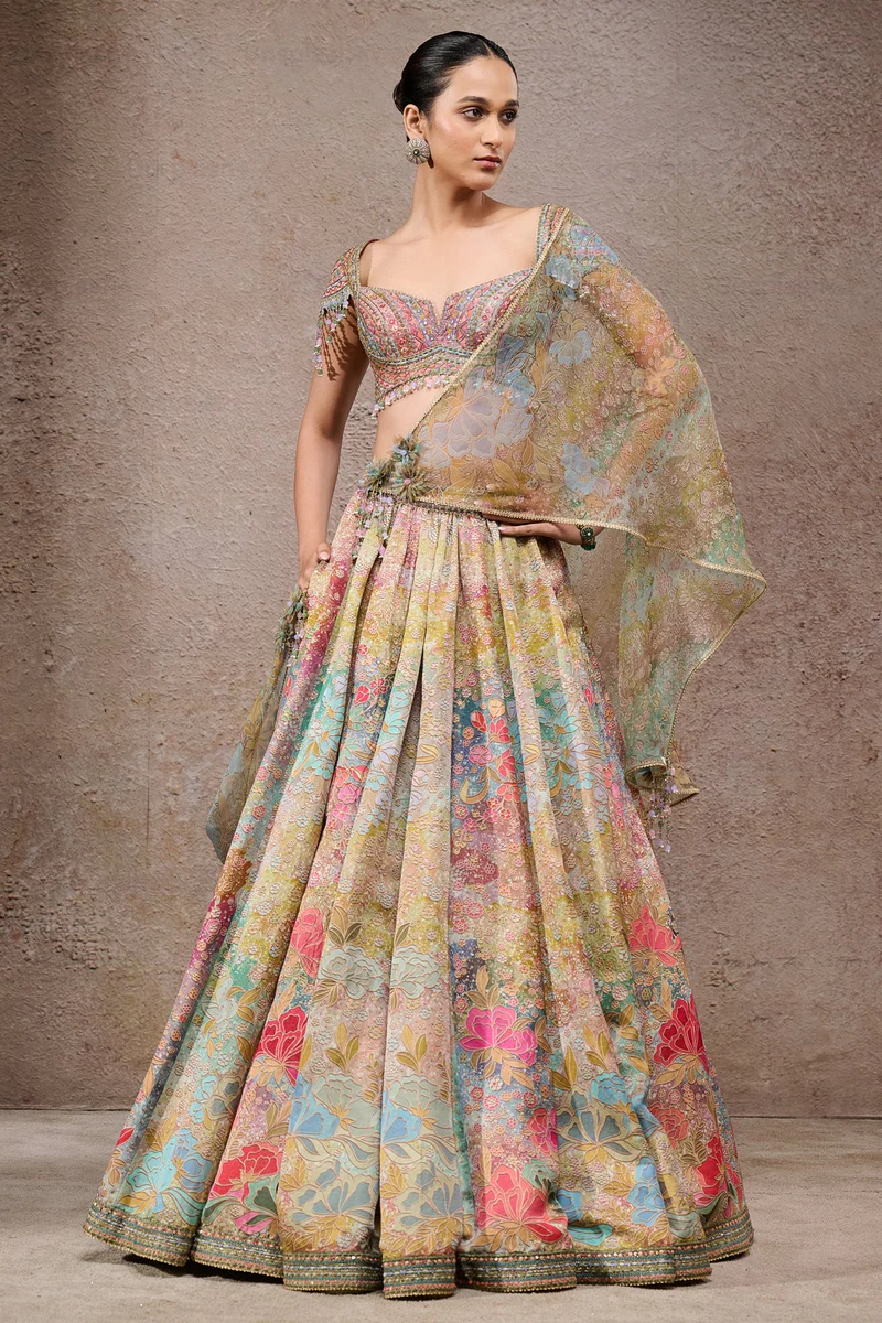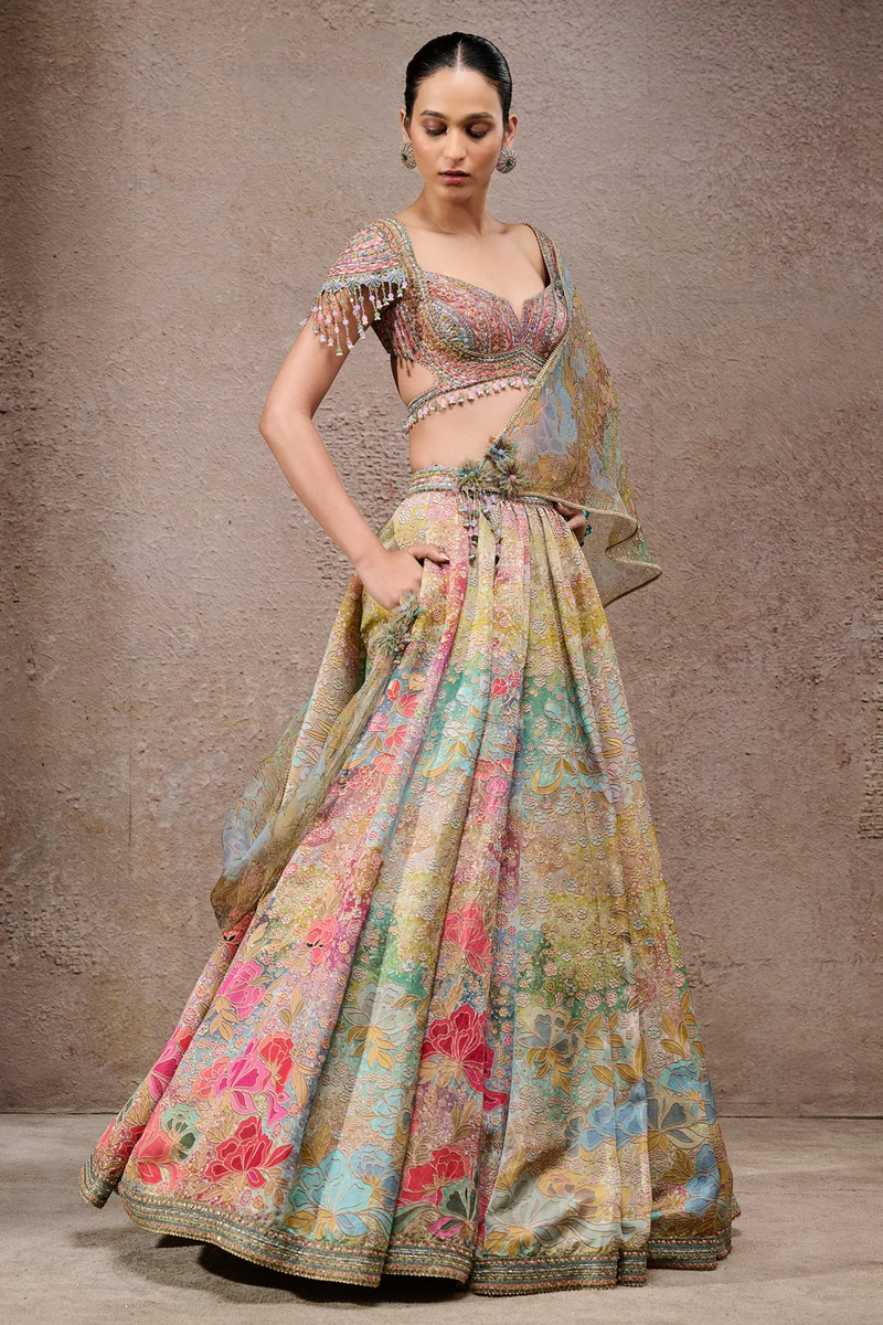 A dreamy blend of textures and tones, this ensemble captures timeless elegance with a modern twist. The lehenga, crafted from luxurious Chanderi, flows effortlessly with every step, exuding a subtle sheen that speaks of understated grace. Paired with a beautifully tailored blouse in rich Kasab satin, it adds just the right touch of sophistication and structure.