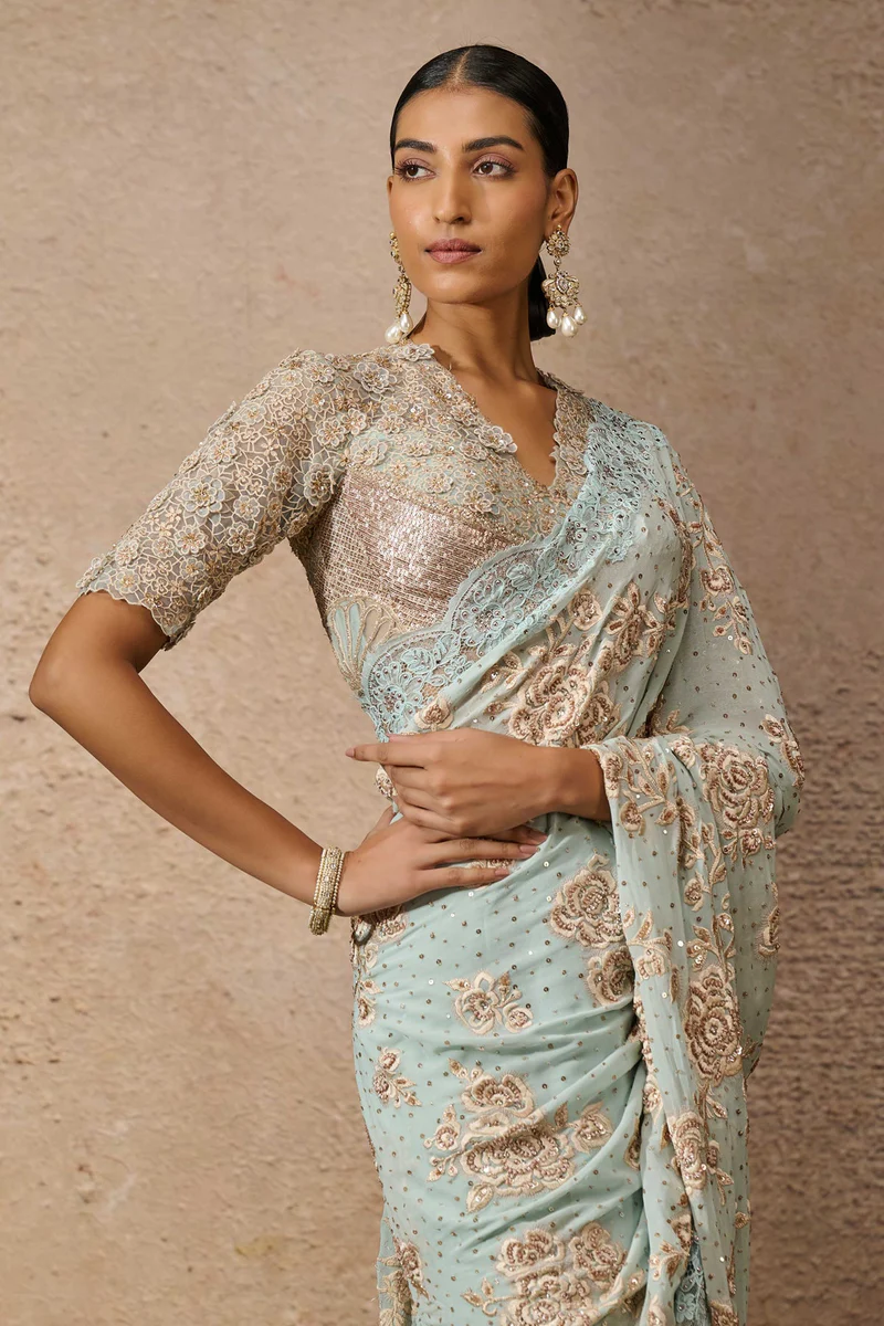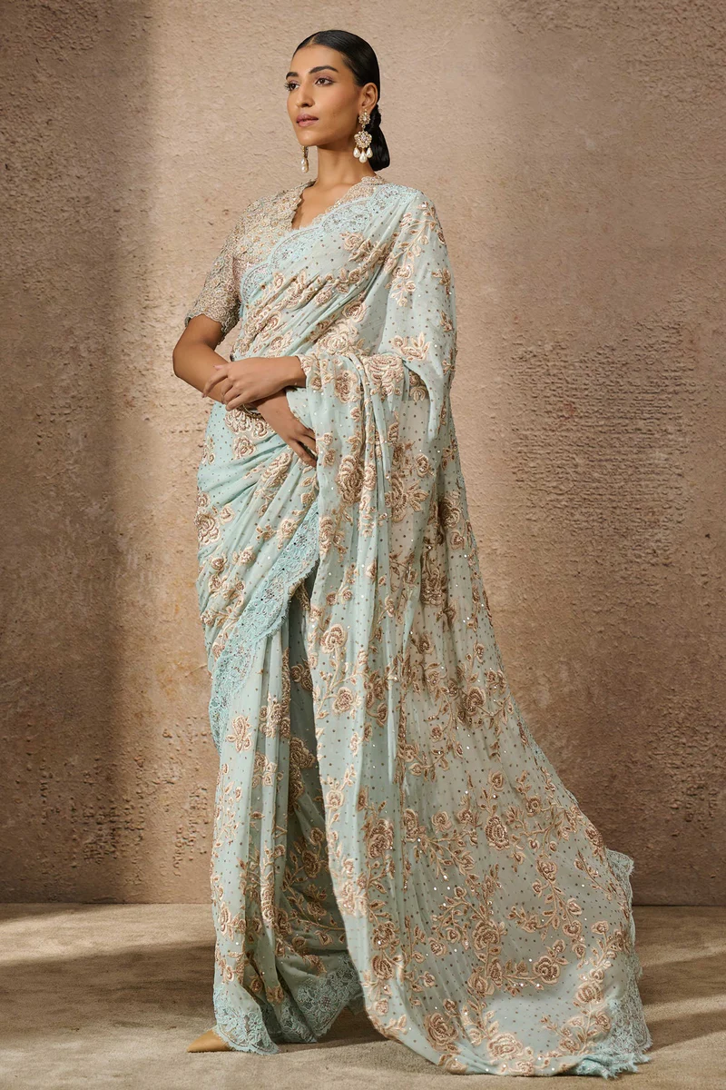 A timeless classic reimagined with a touch of modern glamour, this saree is adorned with delicate threadwork embroidery, further illuminated with twinkling sequin and crystal embellishments for a refined sparkle. Paired with a beautifully embroidered blouse, the ensemble exudes effortless elegance in a dreamy powder blue, crafted in luxurious silk georgette with sheer silk and Indian tulle accents.
