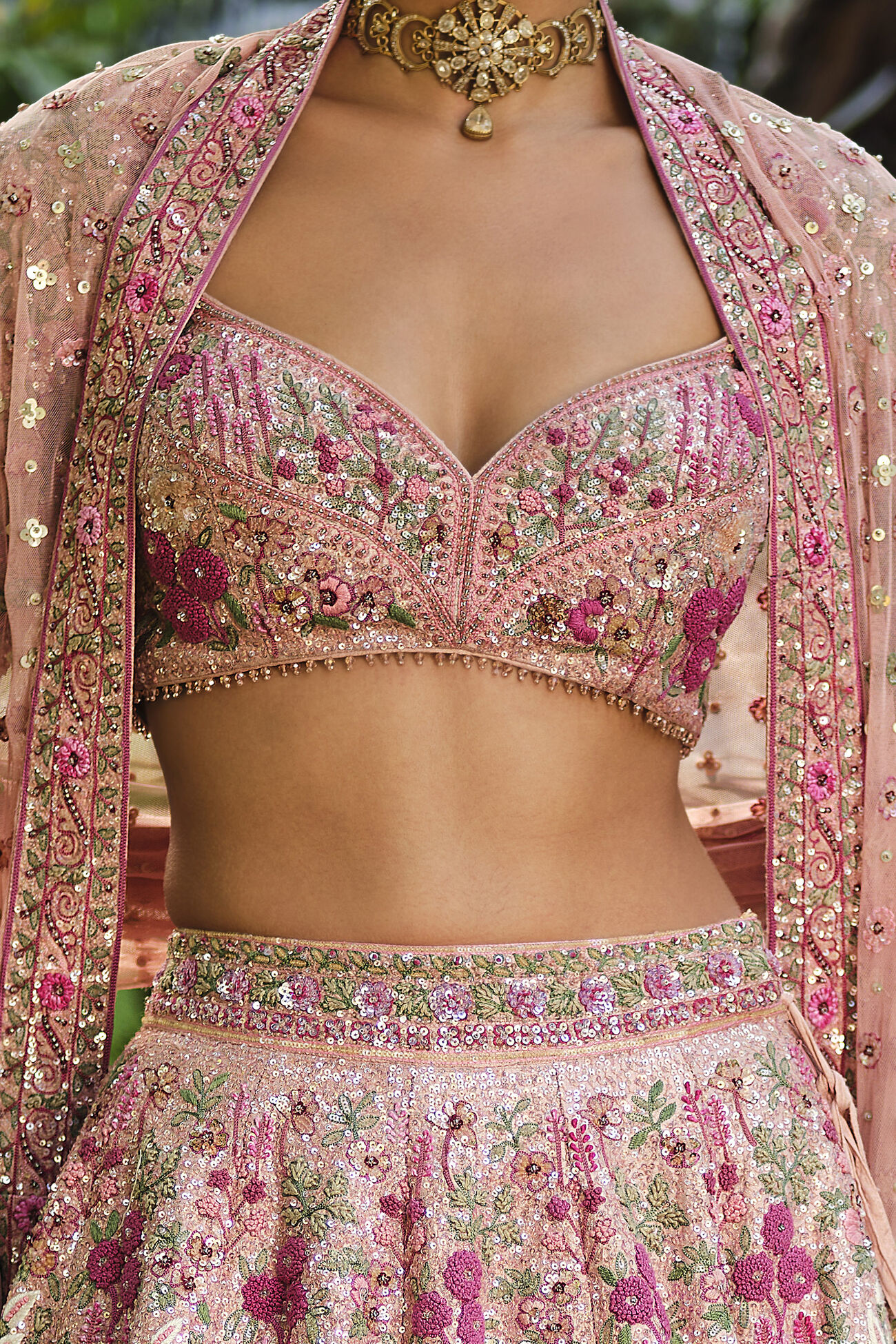 Meticulously crafted in luxurious silk, the ensemble glows with intricate threadwork, shimmering zari, and glistening sequins, weaving together tradition and artistry in every detail. Ethereal yet regal, it’s a timeless expression of elegance meant to enchant and mesmerize.