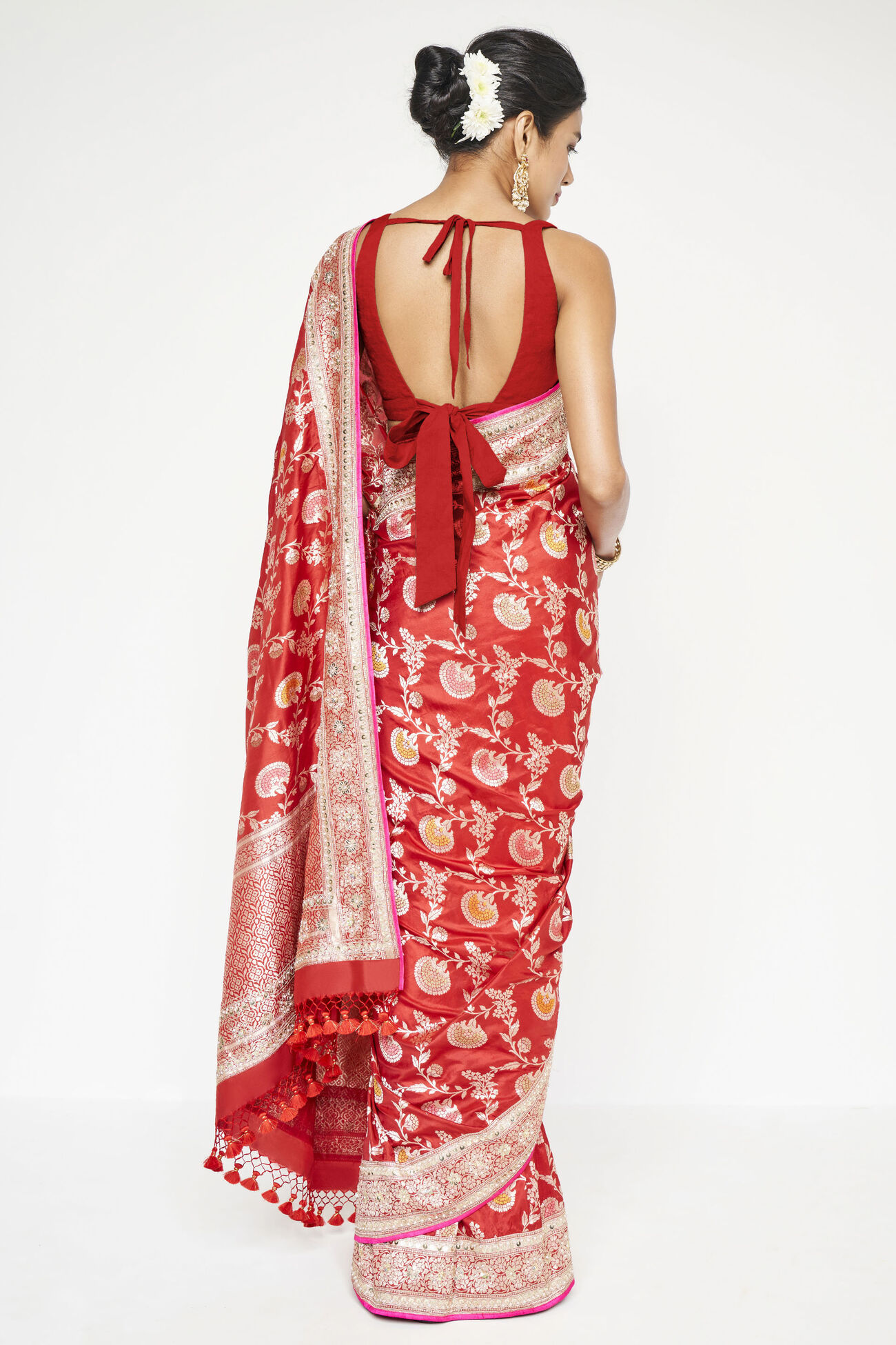 Floral motifs bloom across every inch of our Ganika silk saree, handwoven with care and tradition in the heart of Benaras. A true celebration of craftsmanship, this vibrant red masterpiece wraps you in timeless elegance