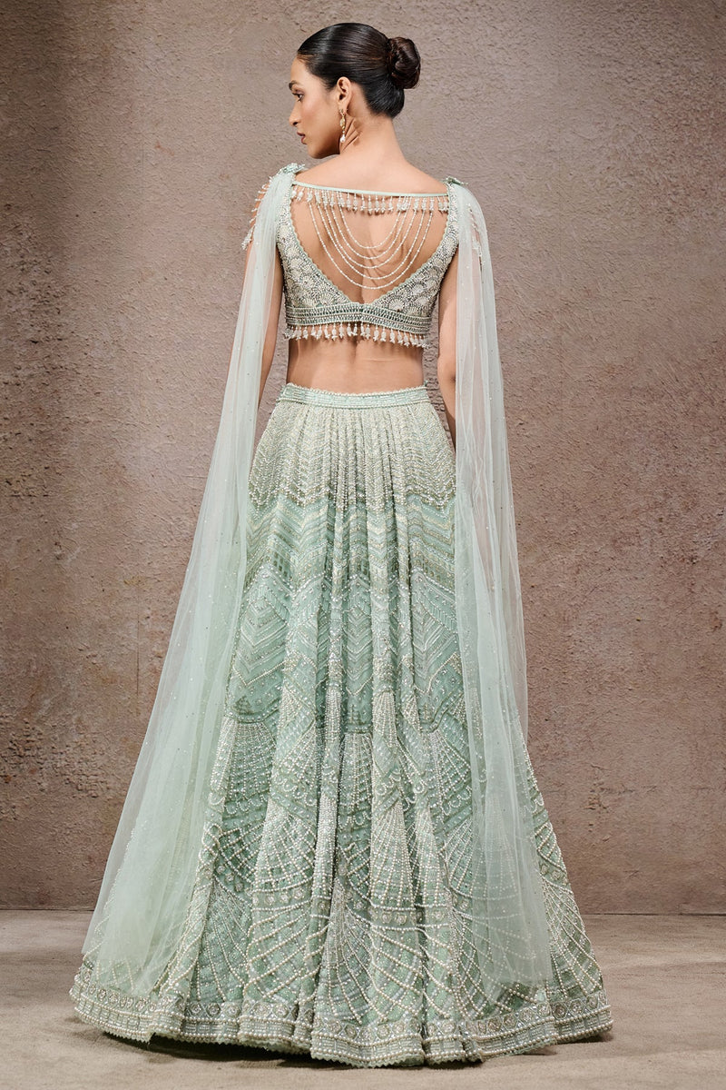 Crafted entirely from luxurious tulle net, the lehenga flows with a dreamy grace, while the sexy blouse adds a touch of bold allure that perfectly balances sophistication and charm. The matching drape completes the look with a soft, romantic flair, creating a silhouette that’s both timeless and modern. Whether it’s a wedding, festive soirée, or a special evening affair, this outfit promises to turn heads and leave a lasting impression.