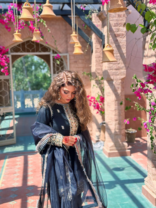 Hadiqa features a gorgeously regal black silk fabric cut perfectly into a short shirt embellished with intricate embroidery on the neckline and hem. It drapes beautifully over a stylish shalwar with a vogue cut and worked hem in silver accents. A sheer dupatta completes the outfit and enhances its charisma.