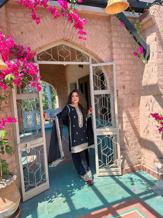 Hadiqa features a gorgeously regal black silk fabric cut perfectly into a short shirt embellished with intricate embroidery on the neckline and hem. It drapes beautifully over a stylish shalwar with…
