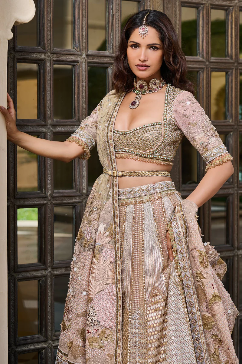 Drenched in timeless allure, this gold sequin-embroidered lehenga dazzles with intricate Mughal jaali motifs, Swarovski sparkle, dabka detailing, and jewelled stones that catch every glimmer of light. Paired with a complementing blouse featuring exquisite Pichwai-embroidered sleeves and a gracefully embroidered dupatta, it’s a masterpiece of Indian tulle craftsmanship.