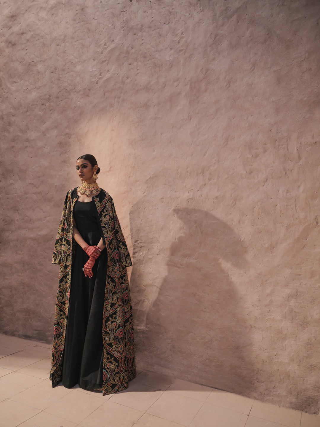 Marvi – Indulge in the mesmerising allure of this resplendent multi-toned embroidered gown, crafted on a canvas of luxurious black fabric. Every intricate stitch tells a story of masterful artistry, with a symphony of vibrant hues dancing across its silhouette.