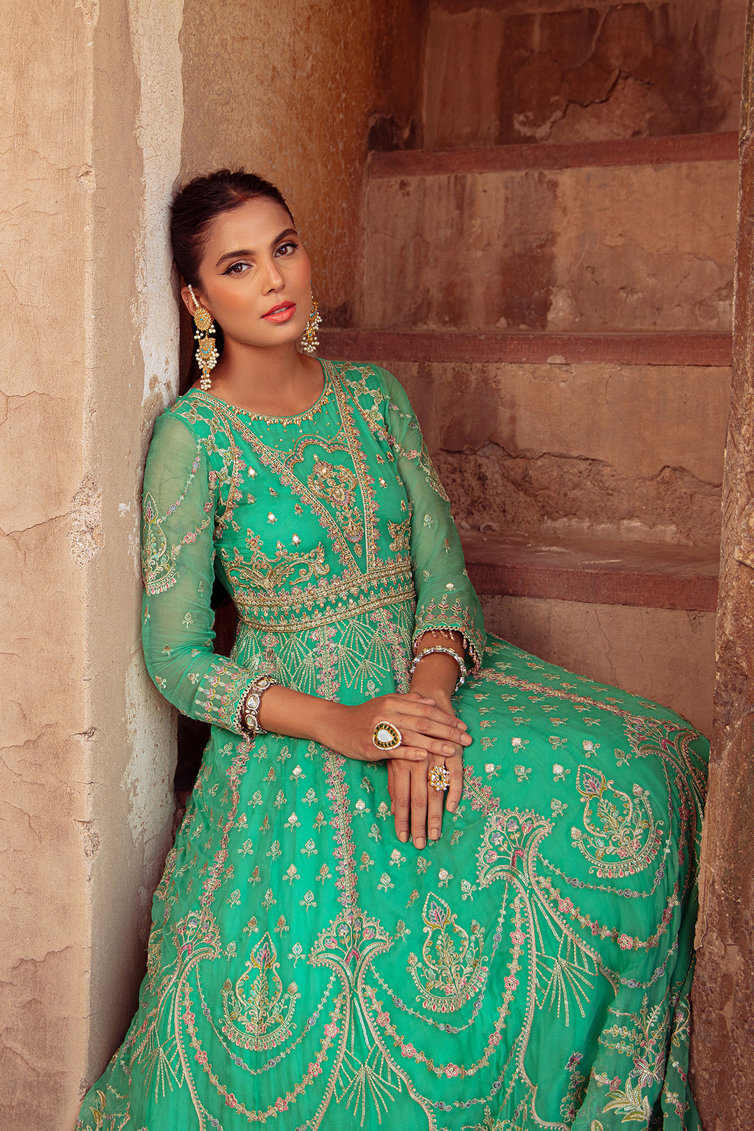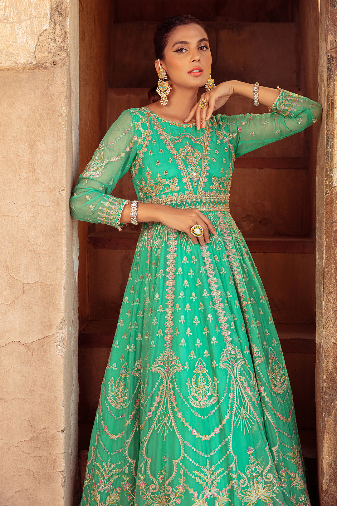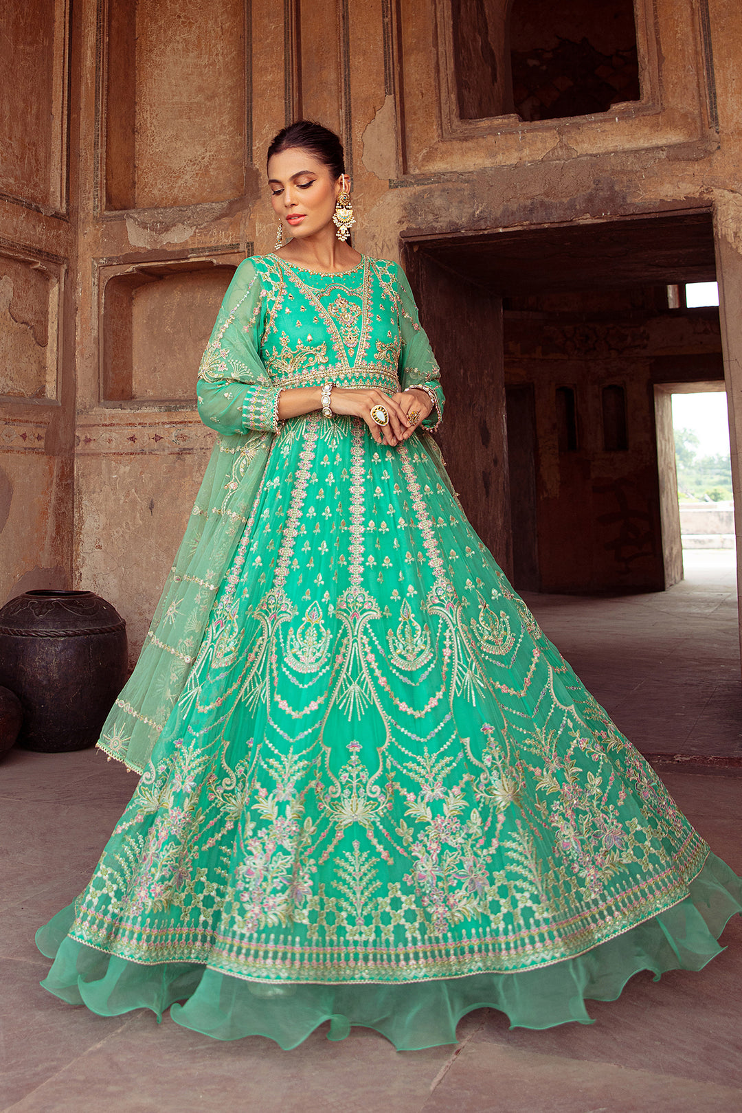 This Jade hued paneled frock is jeweled with heavy machine embroidery & sparkling adda embellishments. The front & back of the neckline is adorned with crystal hangings. The frock dances in the magic of motif panels while the back comprises of statement floral motif. Outfit is finely finished with organza ruffled gathers & topped with heavily embroidered dupatta with sequin work finished with lace.