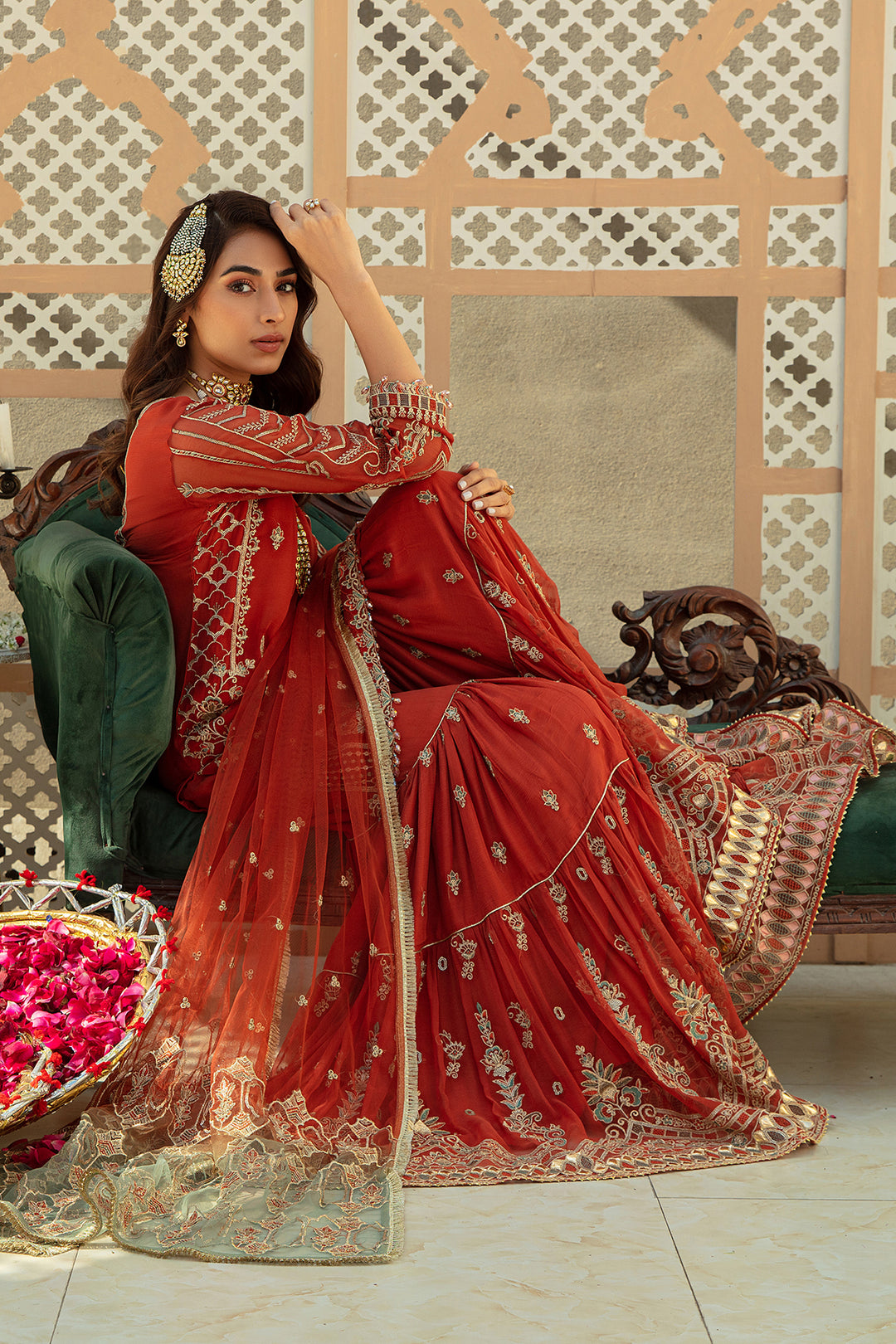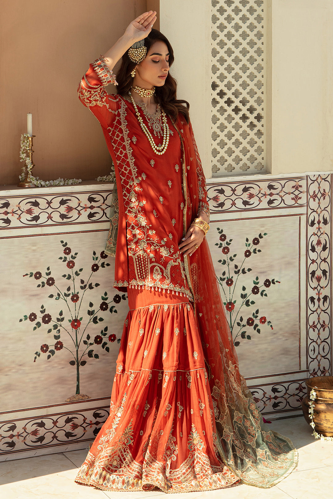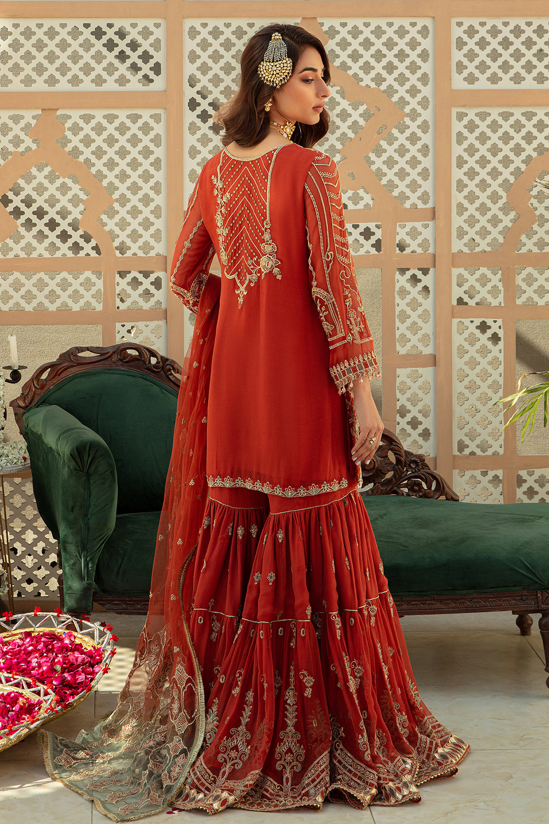 Details: The outfit features elegant crinkle shirt and gypsy gharara with thread, sequin and self jaal embroidered on front, back and sleeves, complemented with embroidered eye catching motifs on gharara. The traditional look is perfected with its tie & dye net dupatta tastefully decorated with embroidery.