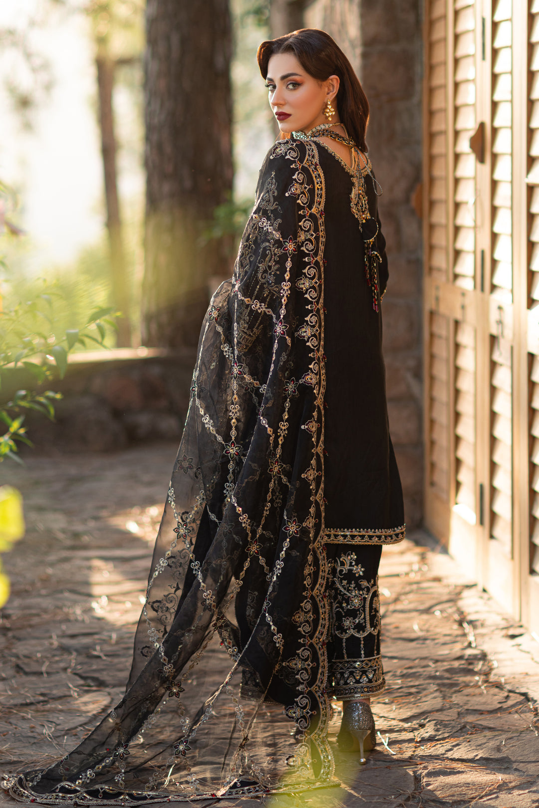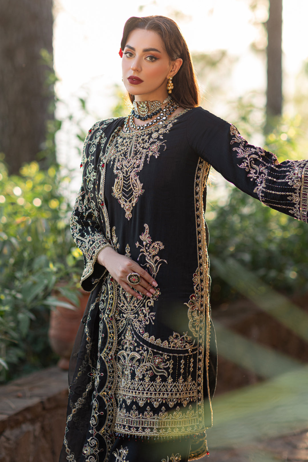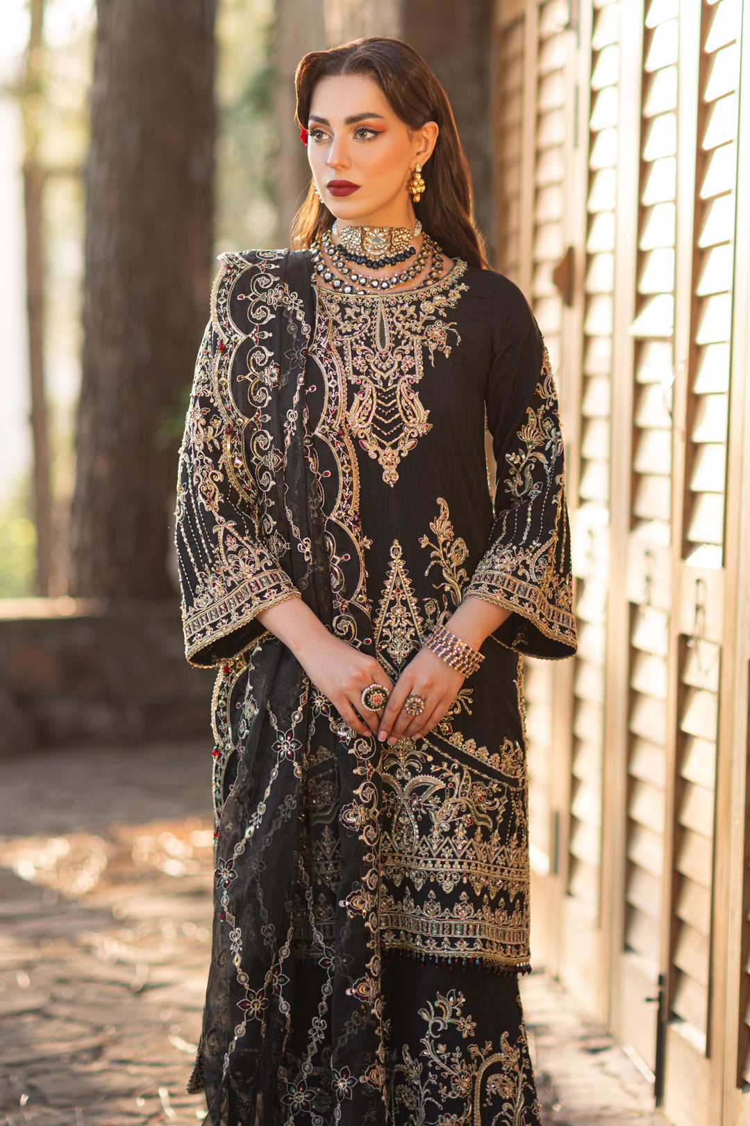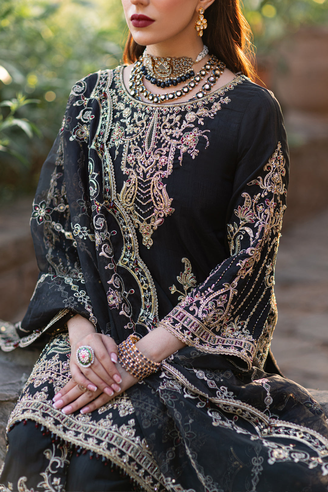 The auspicious black shirt is adorned with fully filled hand embellished front & sleeves including including kora, dabka, crystals, sitari, cutdana, tilla, payal, naqshi & heavy embellishment techniques, embroidery & motification techniques. The front & back side seams are heavily detailed with adda embellishments and embroidery. With heavy border & droplet crystal hangings on the hem, the shirt has minimal contrast touches of greens and reds. The back is enhanced with detailed neckline, border & side seams along with heavy handmade tassels. Qamar is paired with floral hand embellished culottes with embroidery & sequin accents. It is topped with a luscious dupatta with heavy sequin & embroidered jaal finished with 4-sided heavy scalloped border & wine-red droplet hangings.