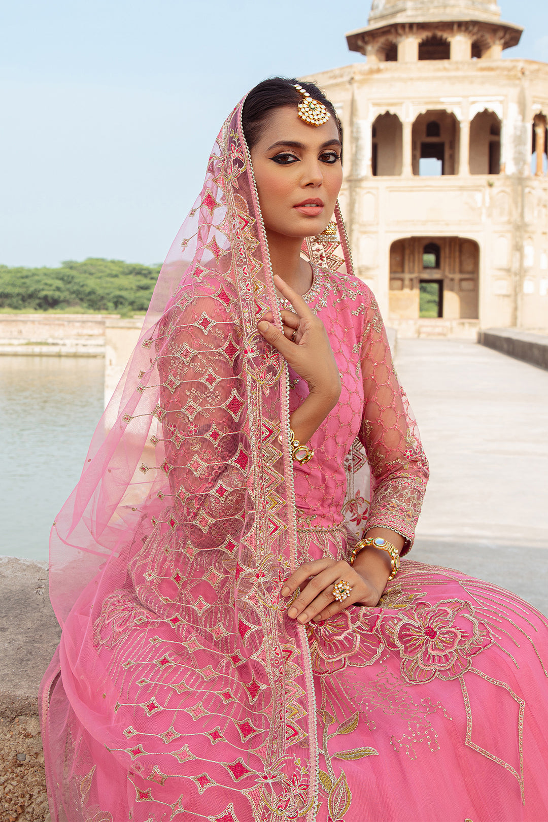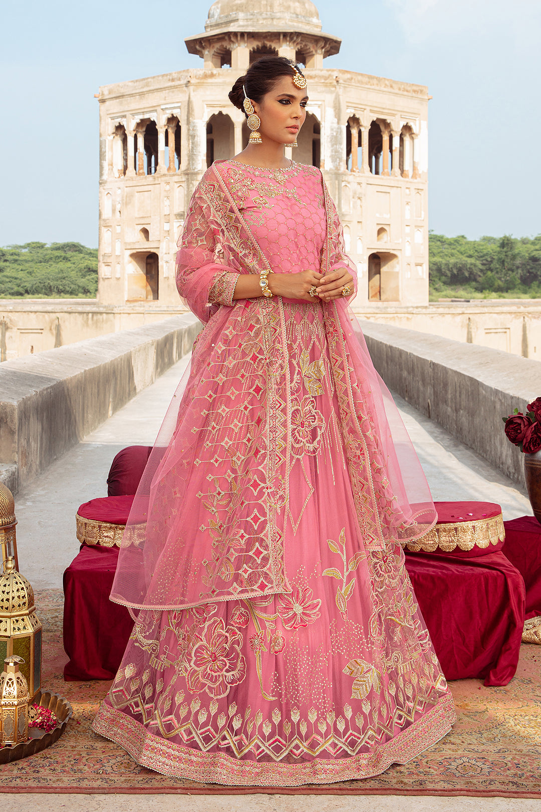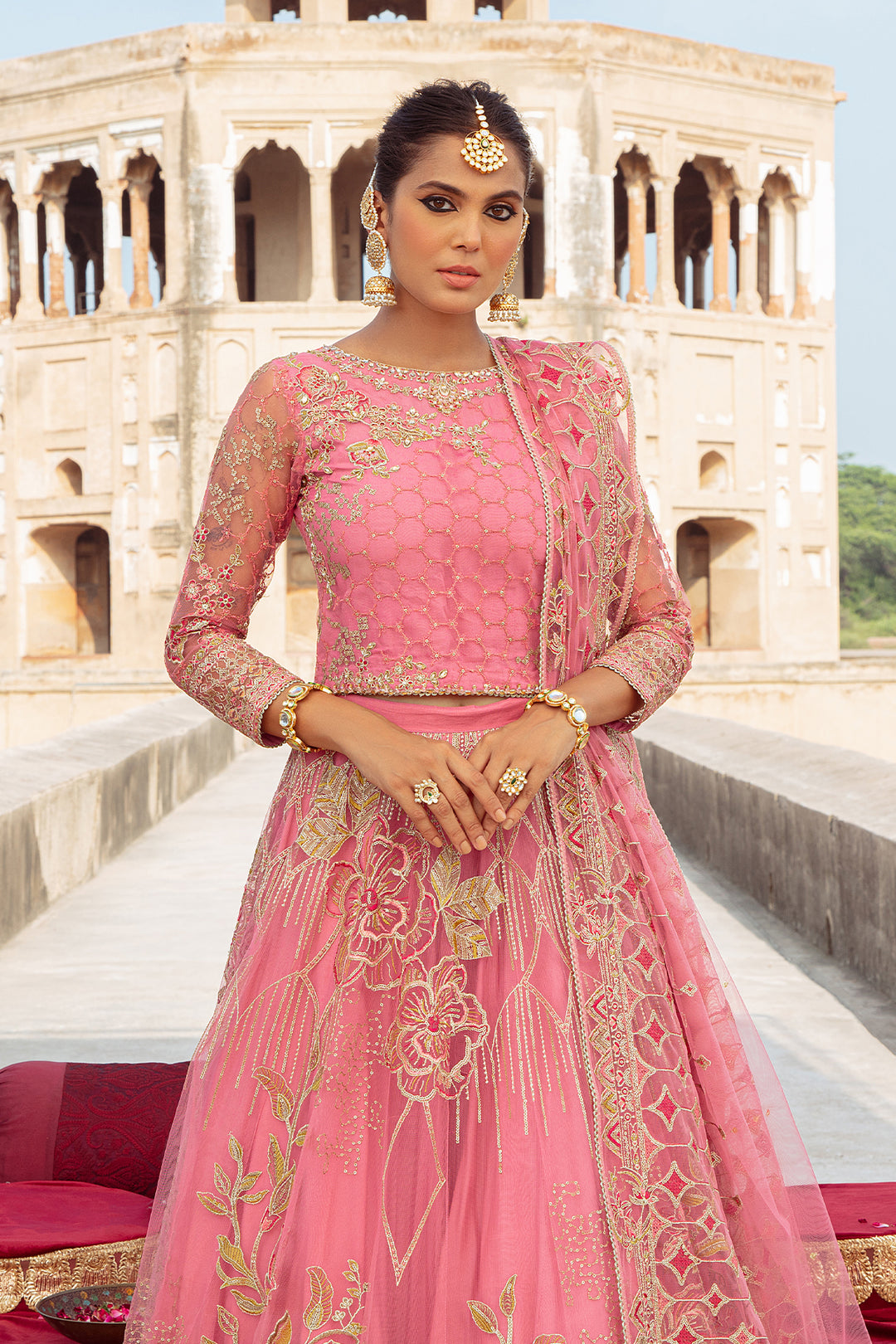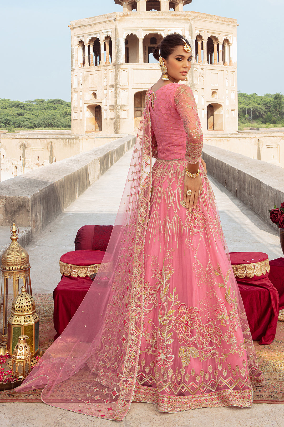Personifying feminine charm, this attire is adorned with sophisticated hand embellishments, heavy machine embroidery, tilla, thread & sequin work. The back of the neckline is adorned with keyhole details along with crystal like hangings. Both lehanga & choli comprise of heavy floral motifs & exquisite borders. Starling Rise comes with heavily embroidered net dupatta with tilla, thread & sequin work details & lace finishing.