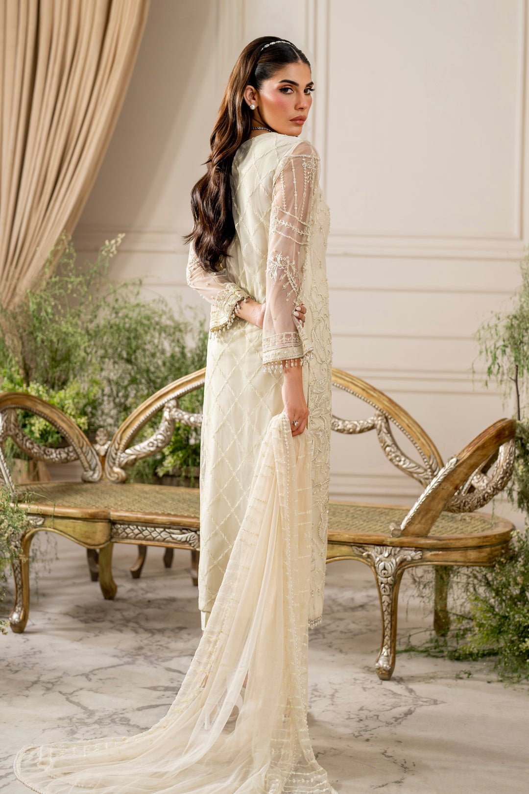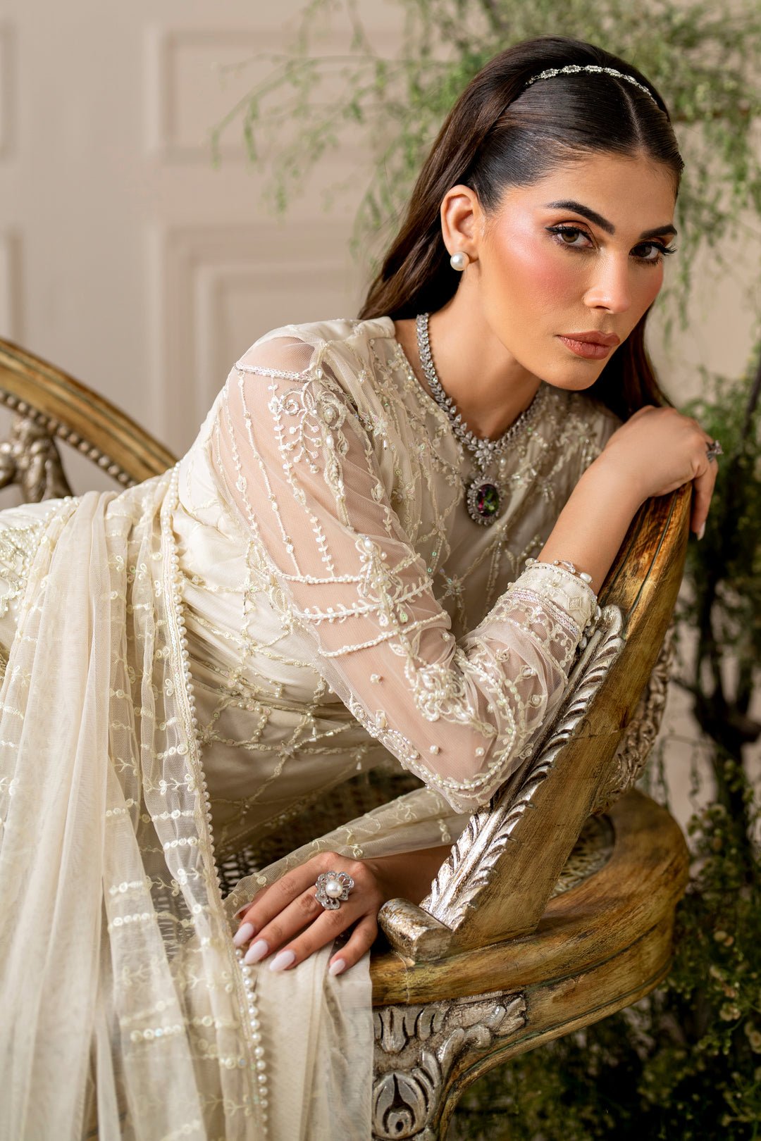 This celestial off-white masterpiece comprises of round embellished neckline along with heavily detailed front & sleeves glistening with same as base hand adda embellishments, pearls, crystals, embroidery, handmade hangings all over, geometrical embroidered patterns & a majestic statement floral motif. The back is adorned with embroidered geometrical pattern with sequin work. The sparkles with length wise 2-sided embroidered line pattern finished with 4-sided pearl encrusted lace. Reverie comes with straight pants.