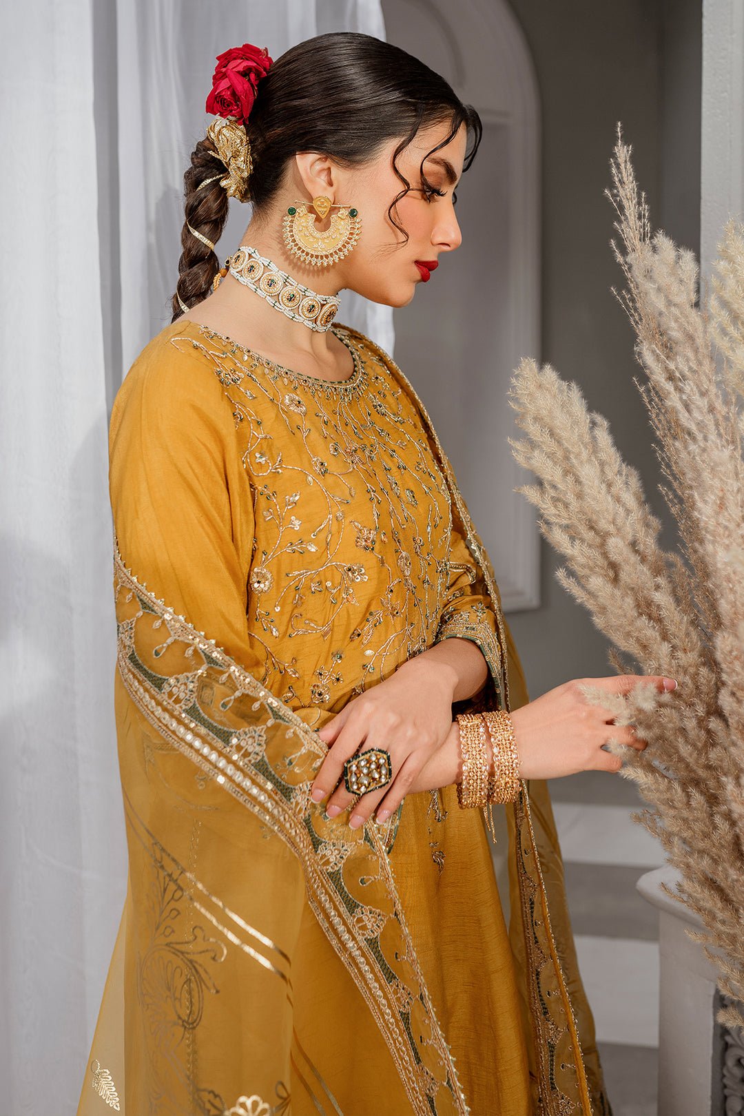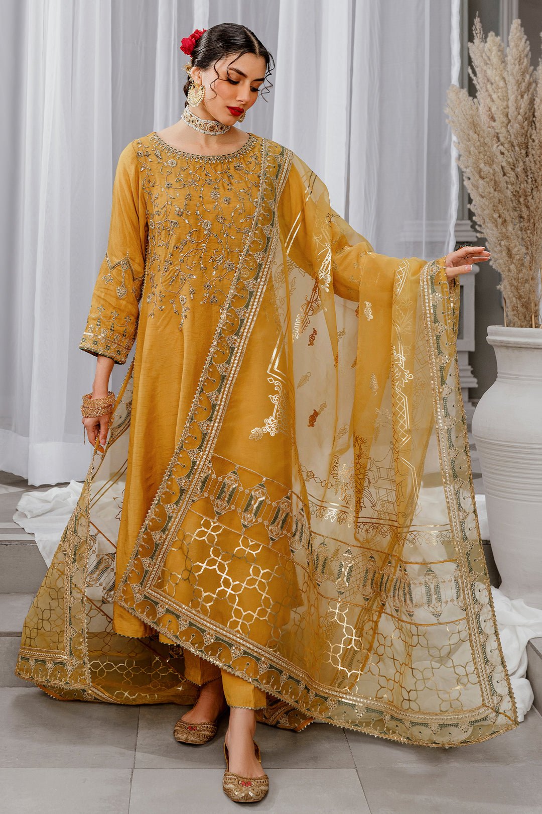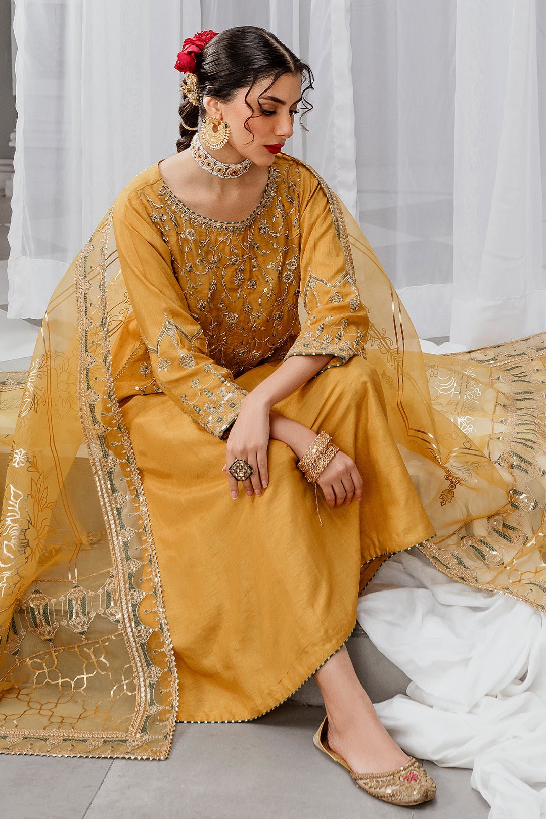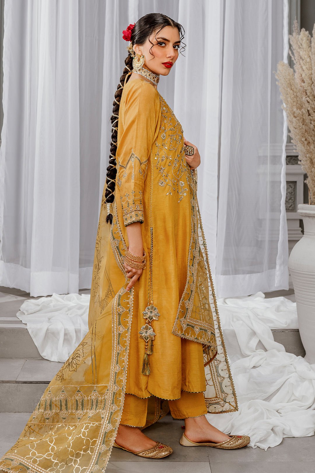 Marigold, a simplistic outfit in a mustard shade is crafted on raw silk. The artfully composed neckline, sleeves and hem features, golden embellishments, contrasting color embroidery and lace and tassel detailing. Combined with straight trousers finished off with samosa lace & organza dupatta enhanced with embroidery and sequin giving off quintessential vibes.