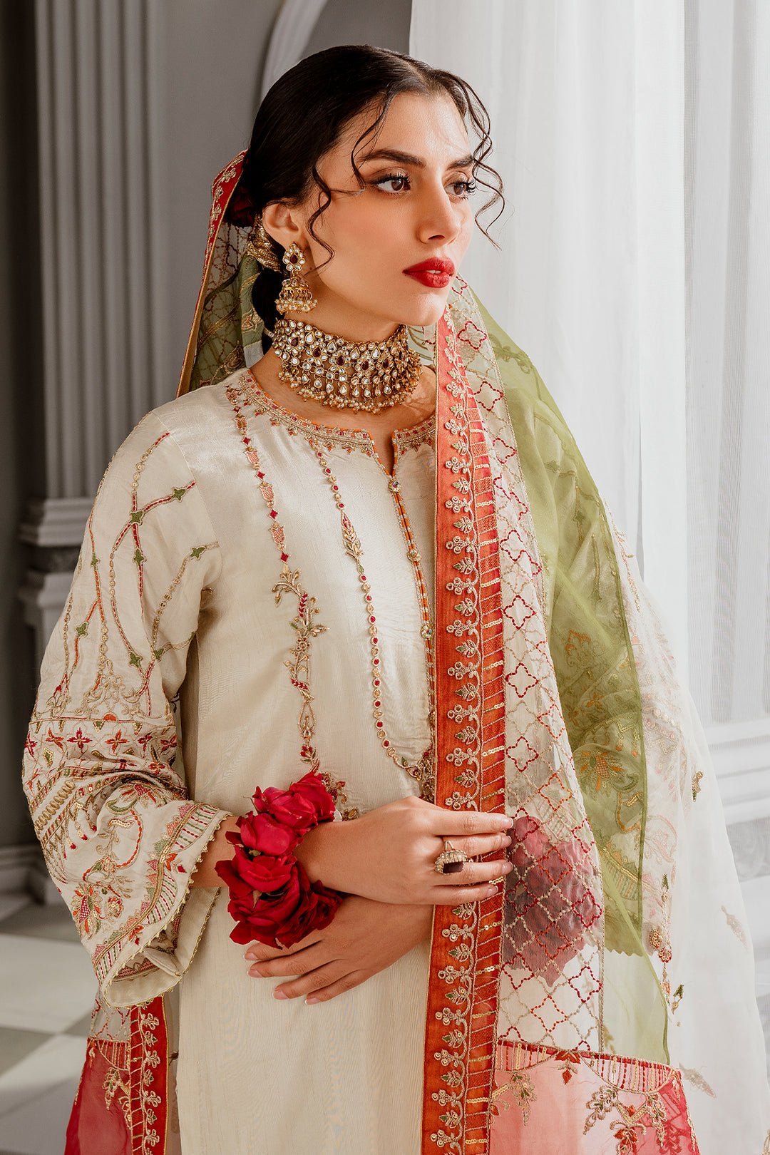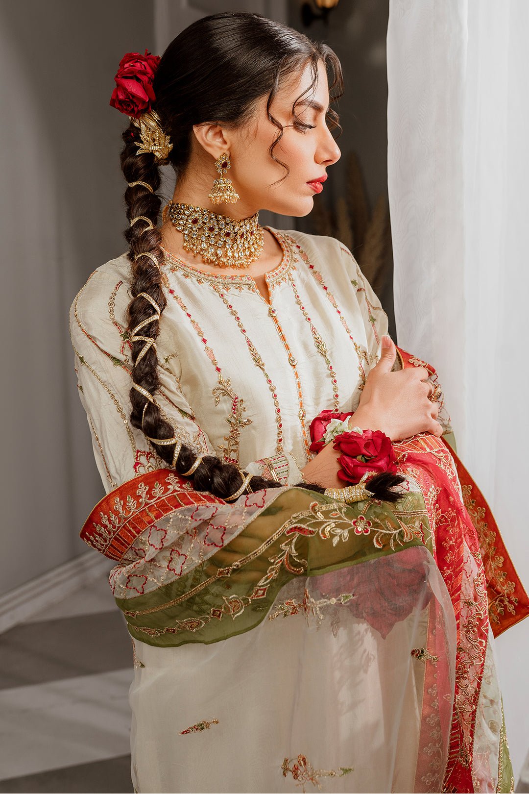 Details: This simplistic yet elegant ensemble, Relish is the perfect addition to your wardrobe. The delicately designed neckline inspired from jewelry motives & shirt is enriched with kora,dabka, sequins & golden pipes. It comes with heavily embroidered culottes and an ethereal multicolored organza dupatta.