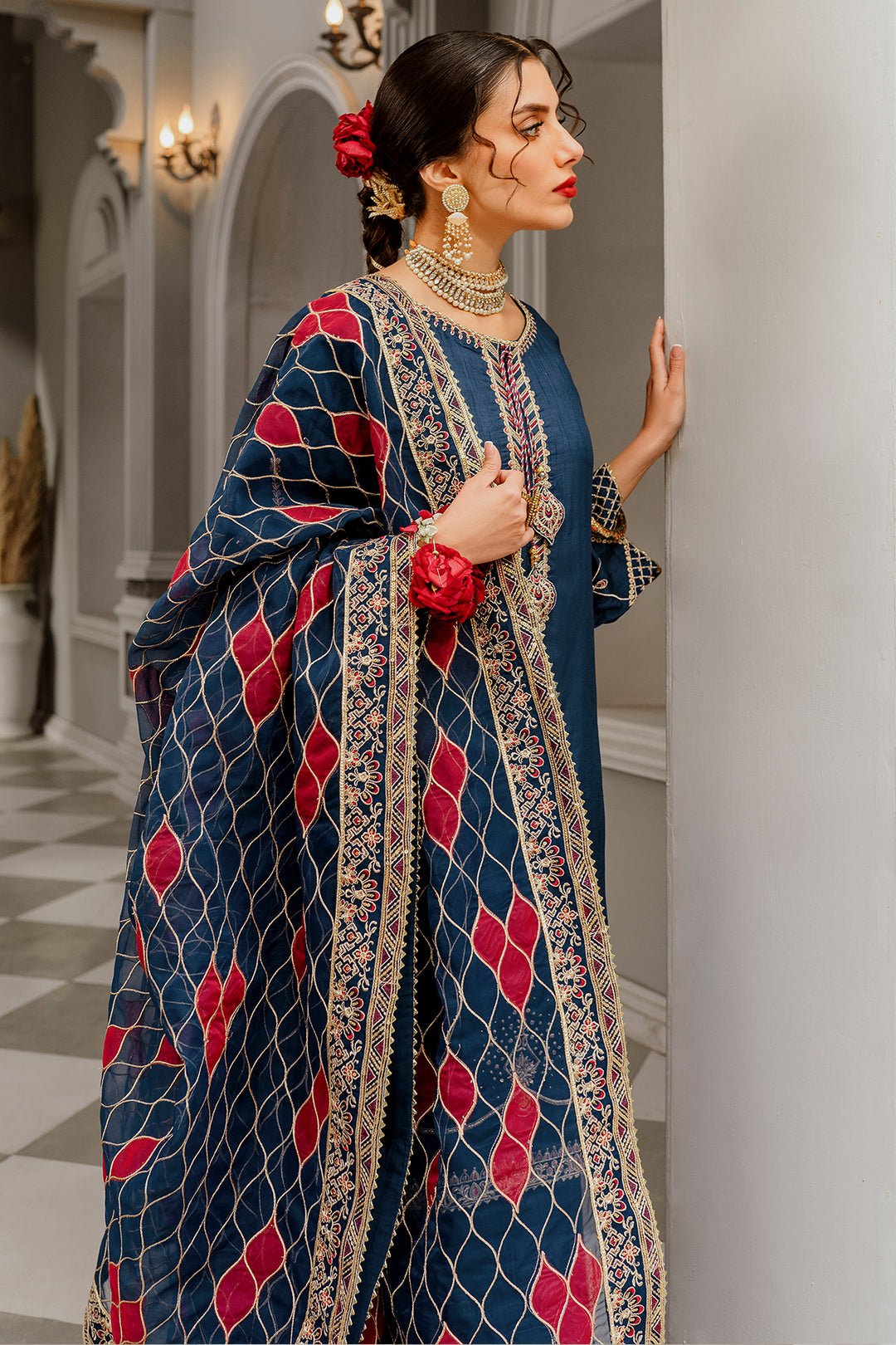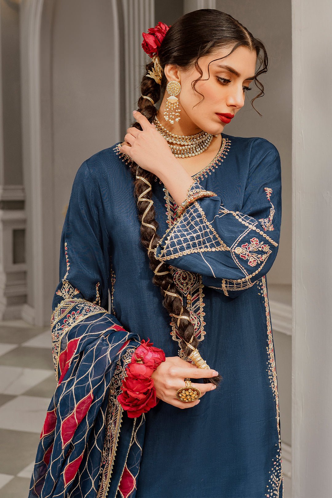 Details: Look resplendent as you drape sheer elegance in splash. A dainty & sumptuous art piece rendered on sapphire blue raw silk featuring a delicately embellished front adorned with embroidered tassels. On the sleeves; we have impressive adda work in an opulent pattern that captures attention perfectly. This eye catching ensemble is paired with a jaal organza dupatta and embellished culottes.