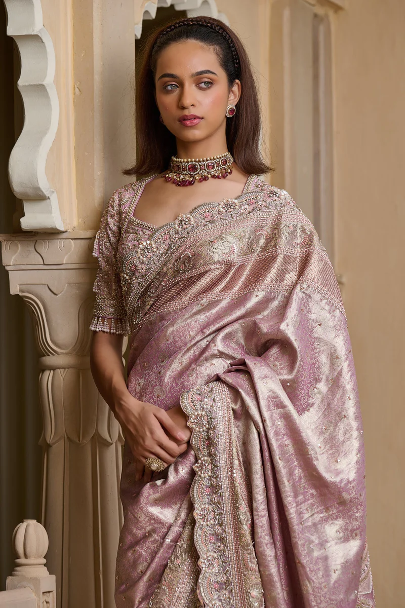 Draped in timeless elegance, this exquisite lilac Kanjivaram saree is a true celebration of artistry and tradition. The luxurious silk gleams with a soft, regal sheen, while delicate Marori embroidery weaves intricate patterns across its expanse, adding a touch of vintage opulence. The scalloped borders, adorned with shimmering crystal embellishments, lend a graceful sparkle that catches the light with every movement