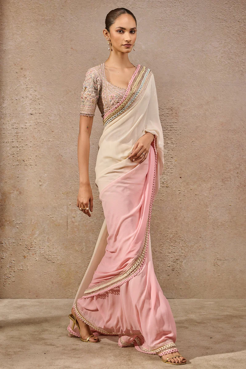 Step into timeless elegance with our Classic Ombre Saree — a dreamy blend of soft blush tones that seamlessly flow into one another, creating a graceful symphony of color. Adorned with exquisite multi-colour lace detailing, this saree captures the essence of modern sophistication while staying true to traditional charm. The look is elevated with a beautifully crafted floral embroidered blouse that adds a romantic touch to the ensemble.