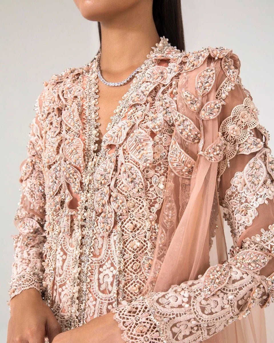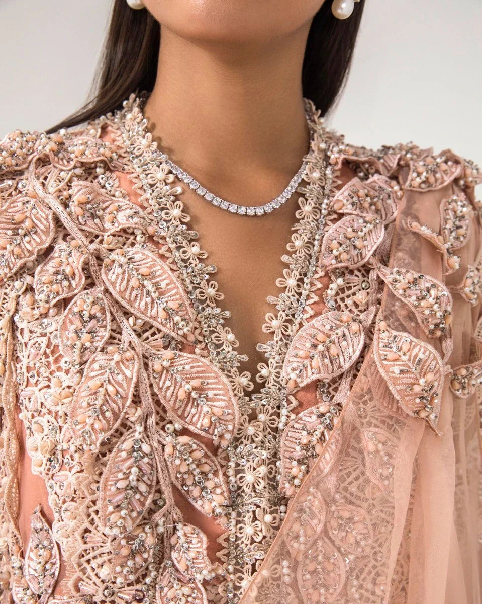 This exquisite peachy pink organza kalidaar is a vision of elegance, brought to life with intricate 3D hand embellishments, sparkling gems, and glittering crystals that shimmer with every movement.