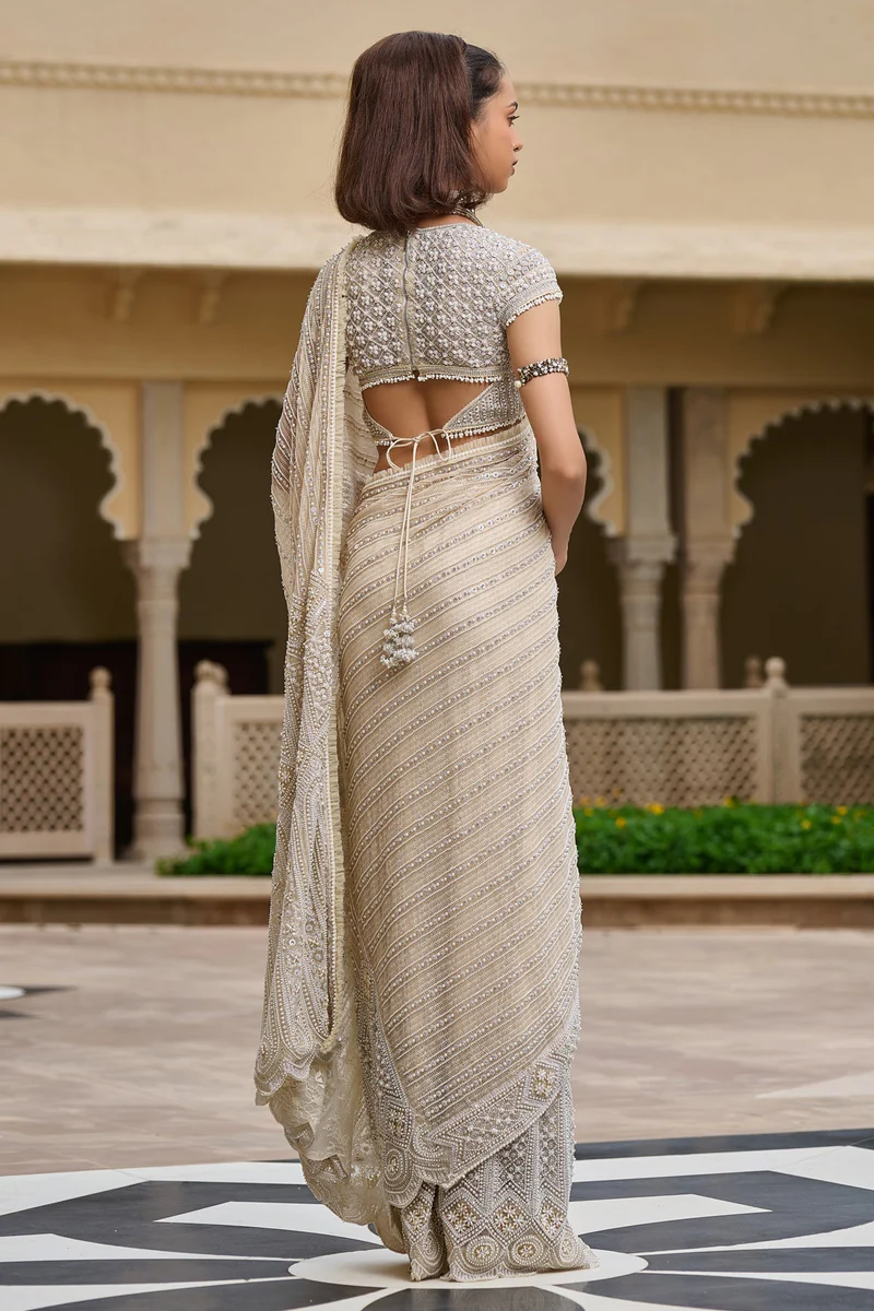 This elegant tulle saree is a timeless, beautifully embroidered with delicate pearl and thread work that adds just the right touch of shimmer and grace. The soft ivory hue enhances its ethereal appeal, making it perfect for special occasions where subtlety meets grandeur. Paired with a perfectly complementing blouse, this ensemble exudes effortless elegance and refined beauty.