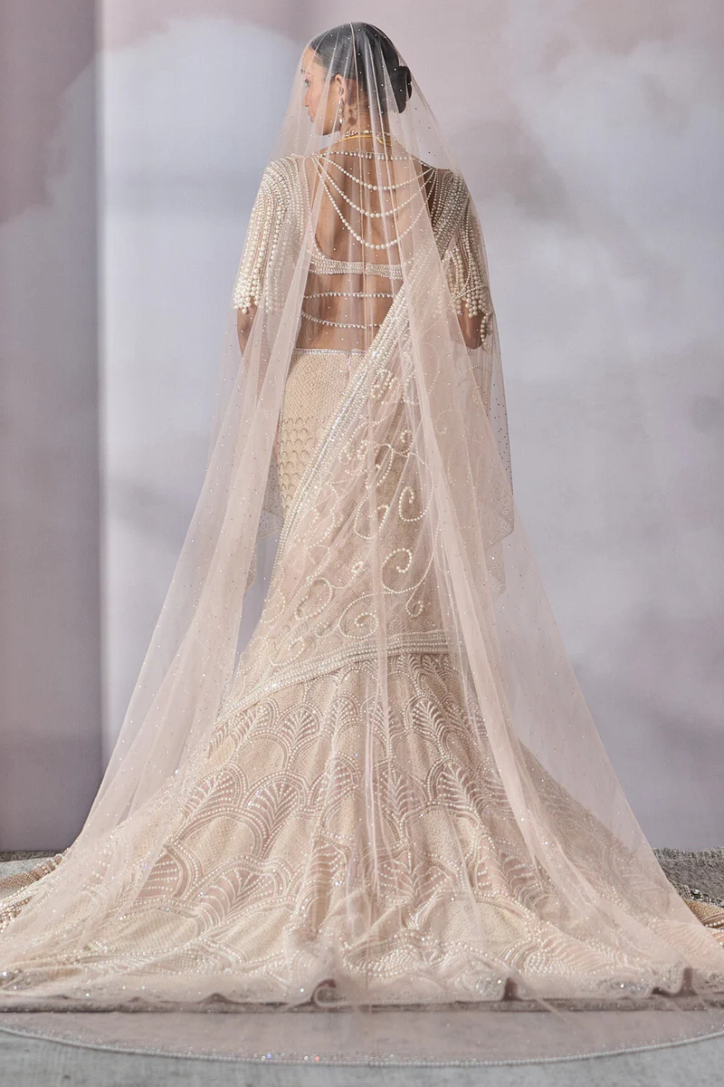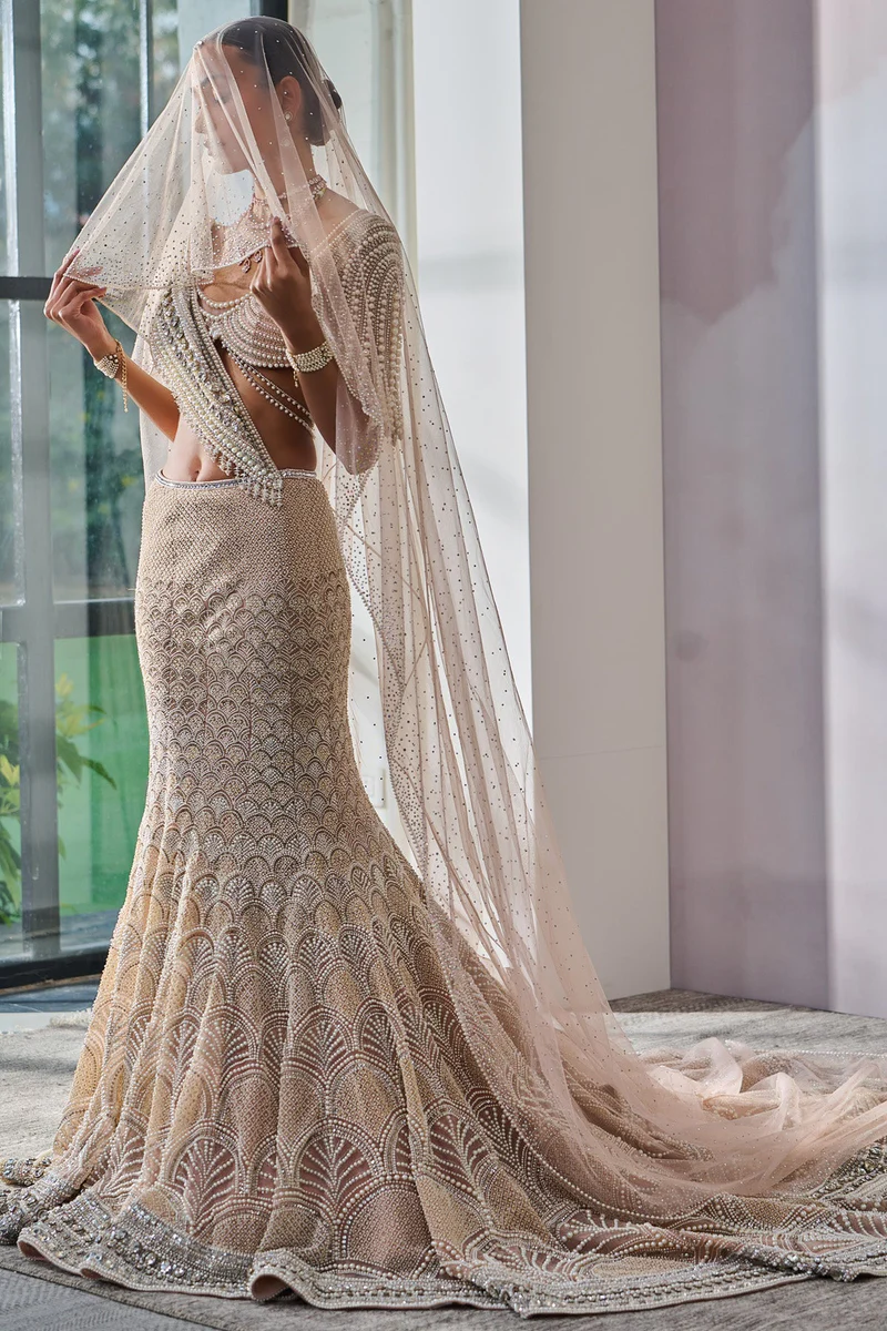 A mesmerizing pearl-embroidered and crystal-embellished lehenga with a graceful trail, paired with a delicately adorned blouse featuring cascading pearl strings, exudes pure sophistication. Completed with a finely crafted dupatta and the signature TT veil, this blush ensemble captures timeless charm with every intricate detail.
