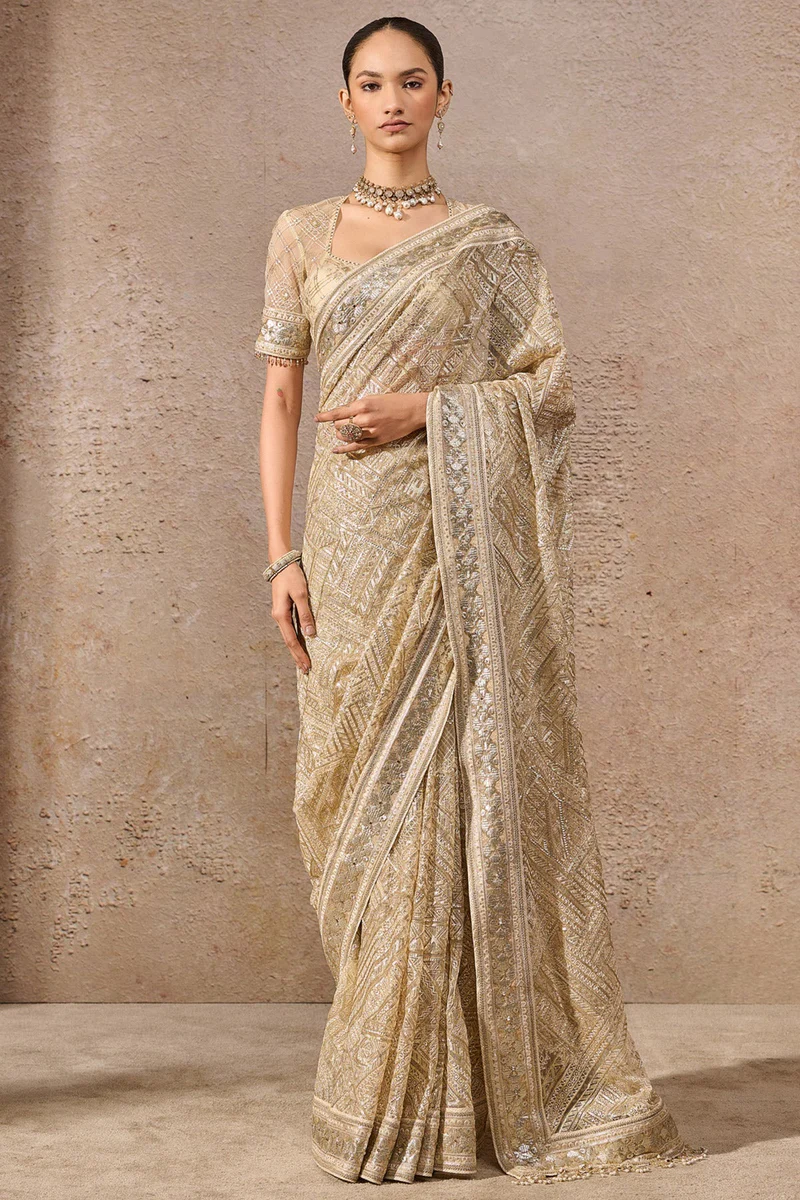 An enchanting blend of tradition and glamour, this ivory saree is a masterpiece of elegance. Crafted from delicate tulle, it features exquisite resham and zari embroidery, intricately detailed and brought to life with shimmering sequins that catch the light beautifully. Paired with a perfectly complementing blouse in matching tulle, this ensemble exudes a refined charm