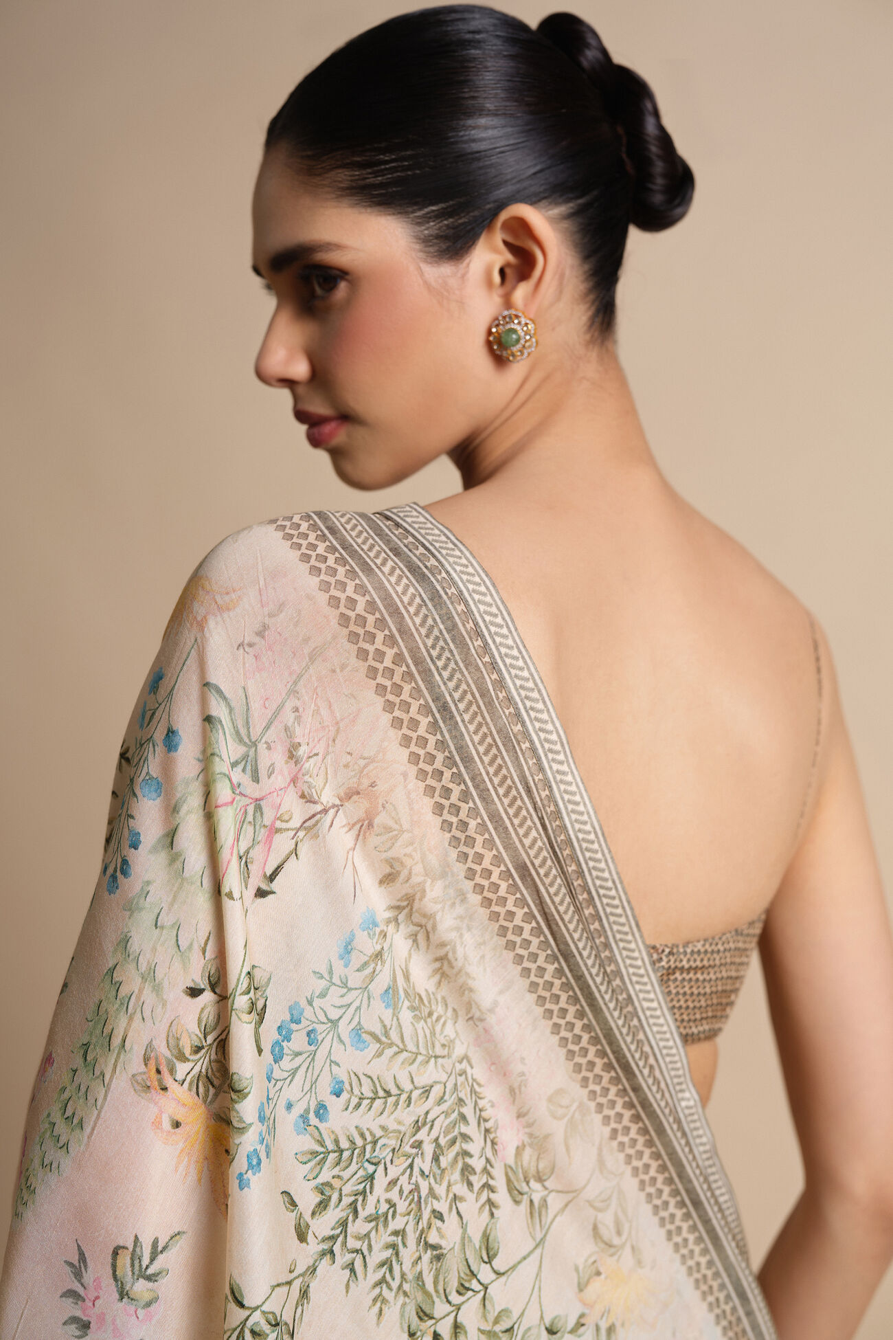 A silk saree adorned with blooming floral prints all over, Romney captures the essence of effortless elegance and timeless charm. Its breezy silhouette, combined with the soft sheen of silk, makes it the perfect drape for sunlit days and warm afternoon gatherings.