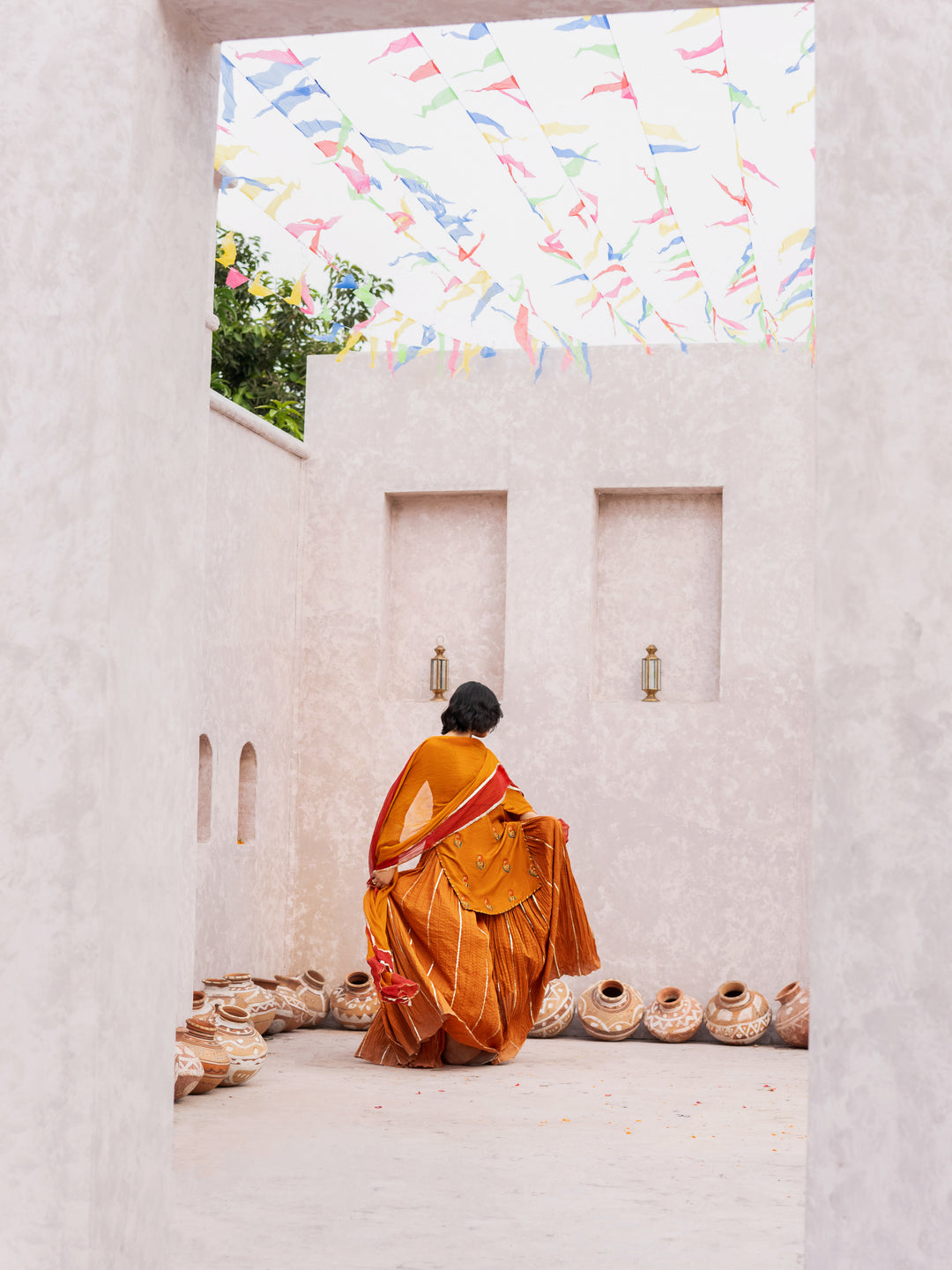 This rust Indian raw silk shirt with the detail of embroidered motifs the maroon gold and green colours of motifs are very eye catching and to get the complete look it’s paired with cotton crushed sharara with gotta work and it’s 2 tone dyed chiffon dupatta uplifts the look.