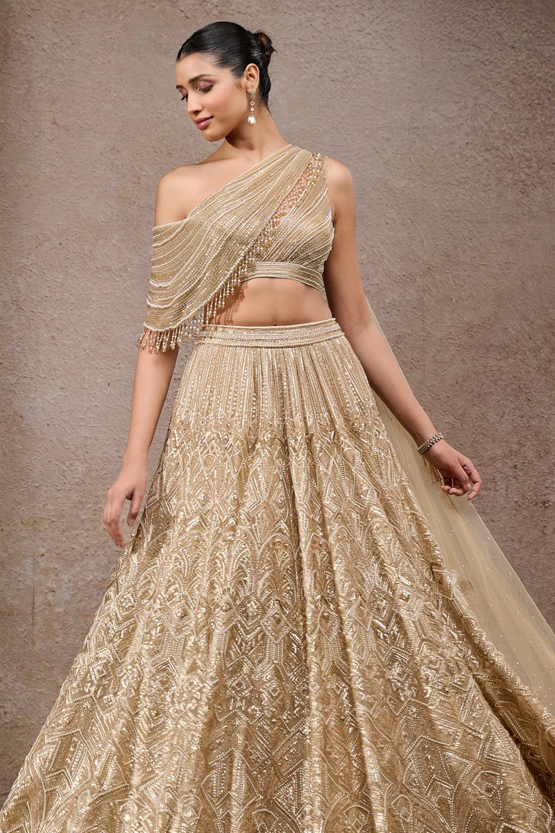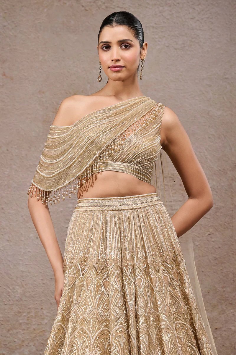 Draped in the dreamy charm of gold, this enchanting lehenga set is a vision of modern elegance and timeless allure. Crafted from luxurious tulle net, the lehenga flows effortlessly with every move, catching the light in all the right ways. Paired with a sultry, delicately designed blouse in matching tulle net, it strikes the perfect balance between sophistication and seduction.