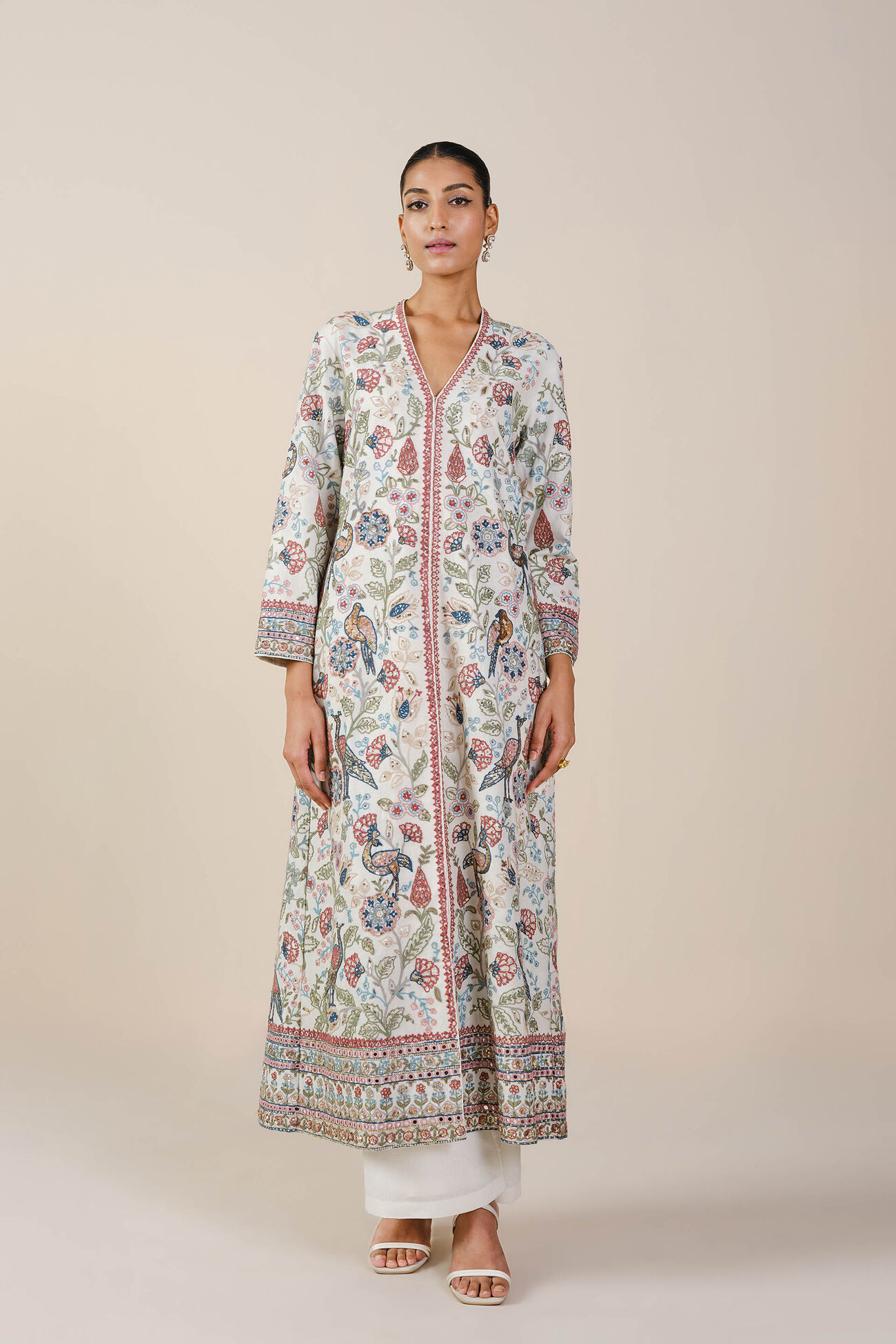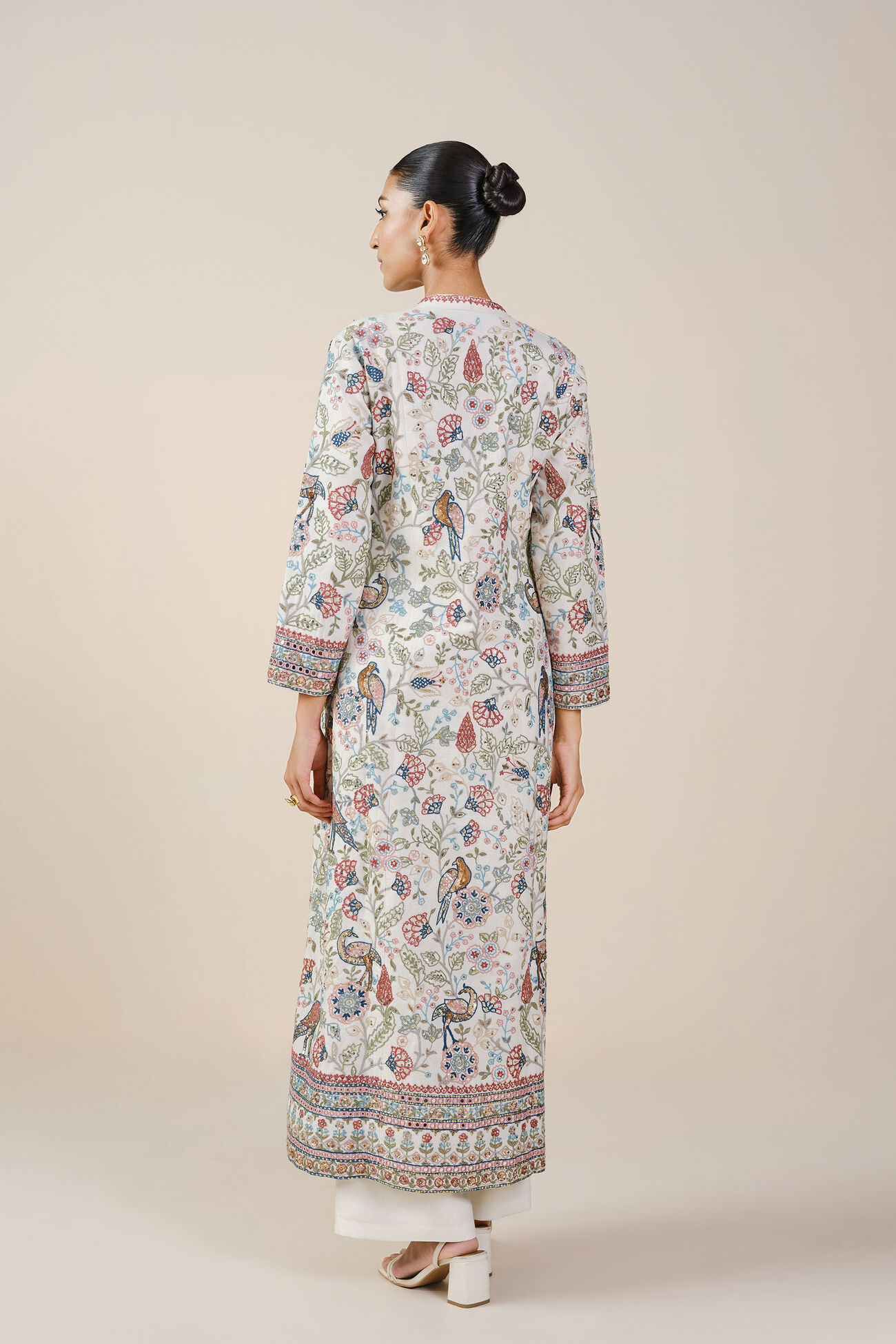 Immerse yourself in the enchanting charm of nature with this exquisite silk ensemble, where the resplendent flora and abundant fauna of the forest come to life through the intricate, hand-embroidered artistry of the talented women artisans of SEWA.
