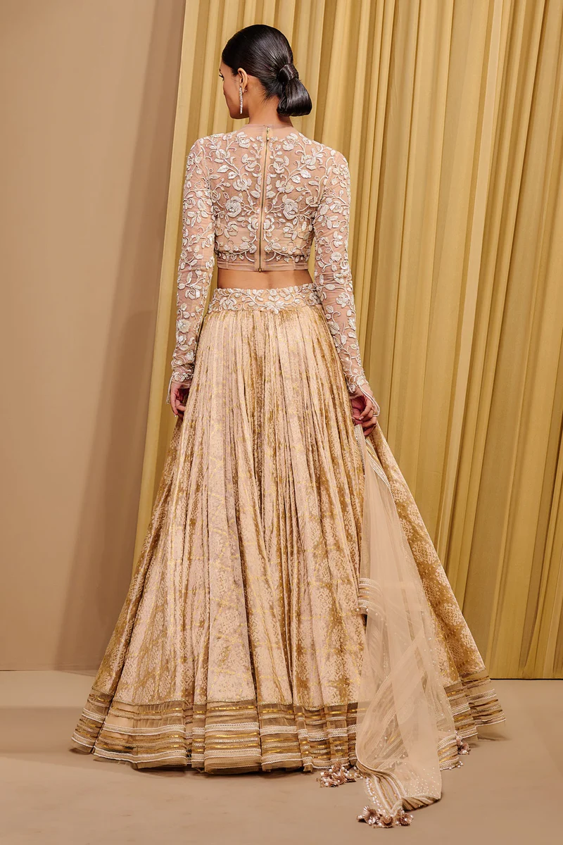 This stunning ensemble brings together the perfect fusion of textures, tones, and timeless elegance. The blouse, crafted from delicate tulle, lends a soft, ethereal charm that contrasts beautifully with the rich satin bustier beneath, adding depth and structure to the silhouette. The lehenga, made from premium textile fabric, flows gracefully with every step, radiating luxury and sophistication.