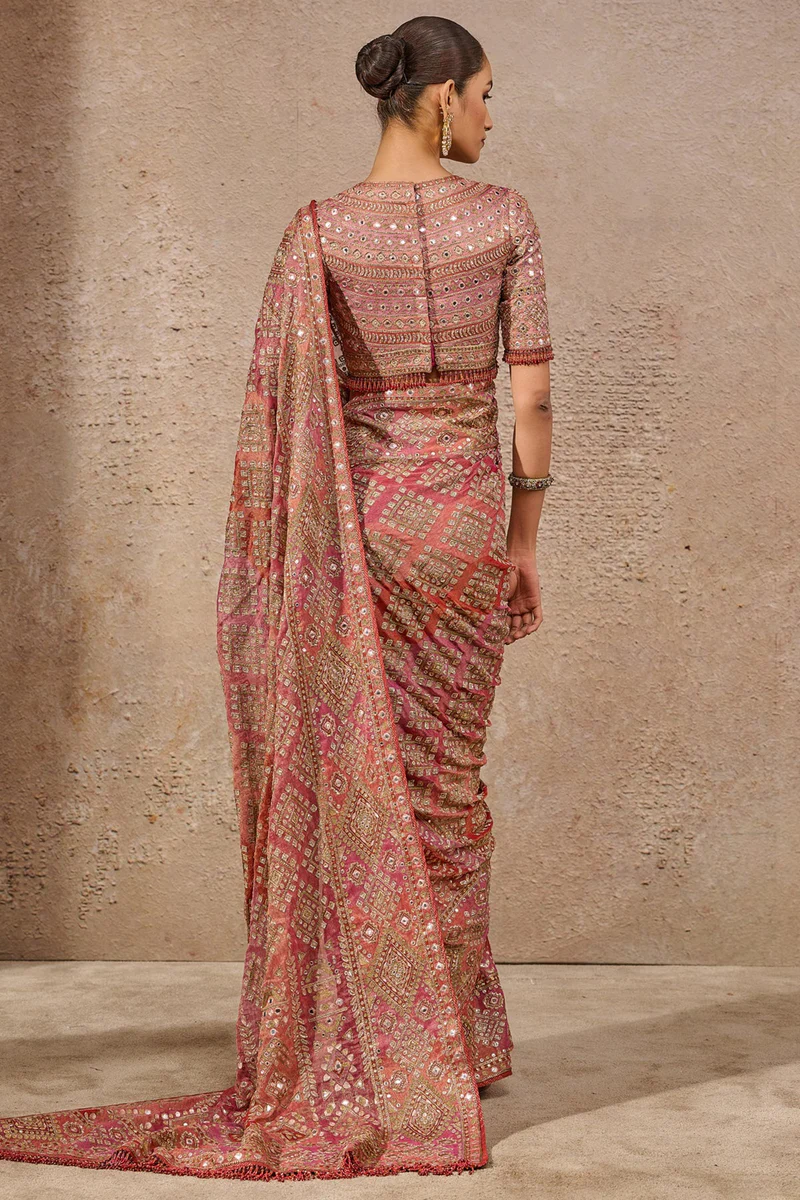 The Signature Kashida saree is a true celebration of artistry and tradition, brought to life through exquisite hand-embroidered mirror work that catches every glimmer of light. Crafted from luxurious tissue georgette, the saree drapes gracefully, blending timeless elegance with a contemporary flair. Its complementing embroidered blouse enhances the ensemble perfectly, adding depth and charm to every detail.
