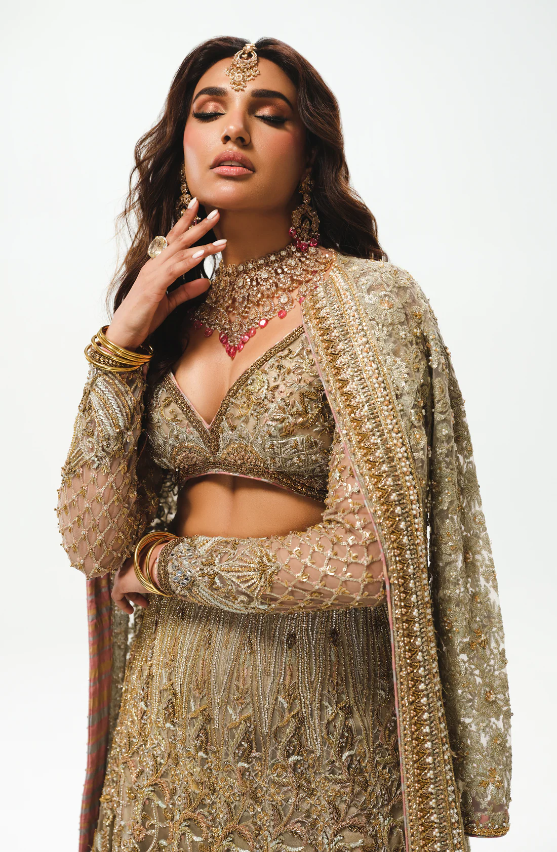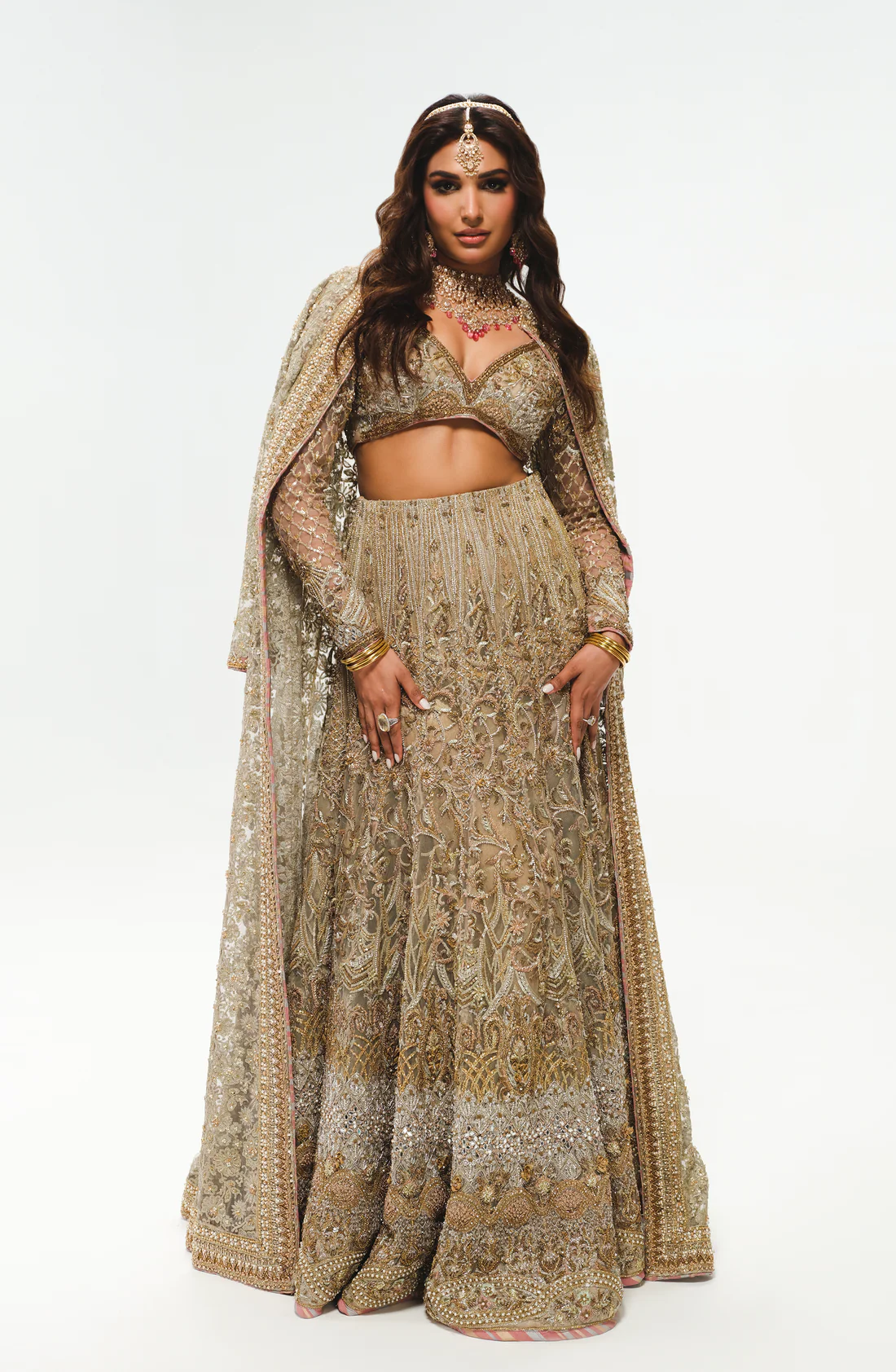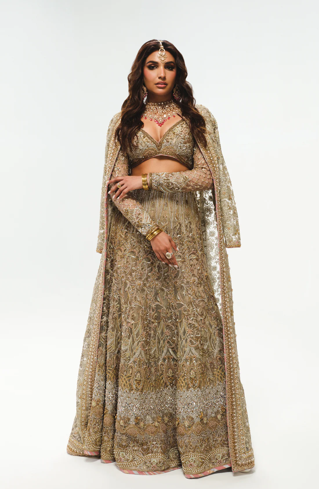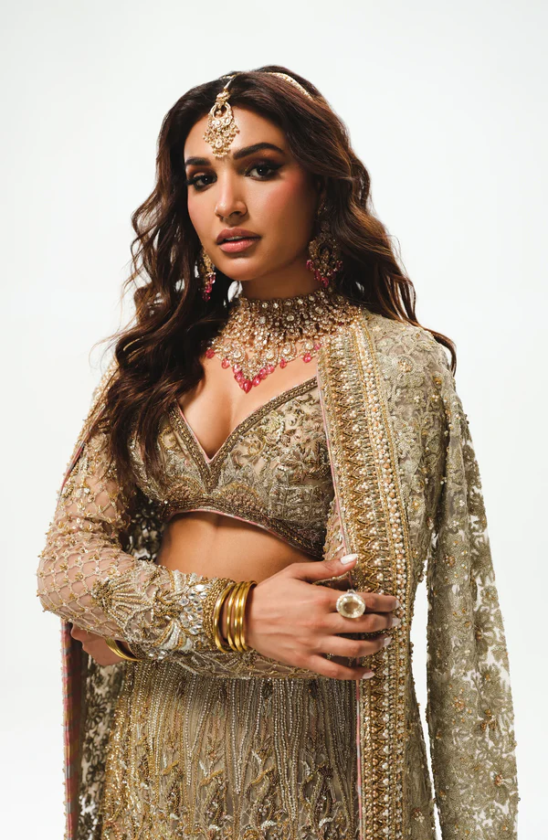 A breathtaking silver-grey ensemble that instantly commands attention, this stunning creation features a graceful lehenga paired with a beautifully crafted choli, adorned with exquisite ganga jaamni embellishments that shimmer with every movement. The delicate pink chattapatti edgings add a subtle yet striking pop of color, elevating the overall charm of the outfit