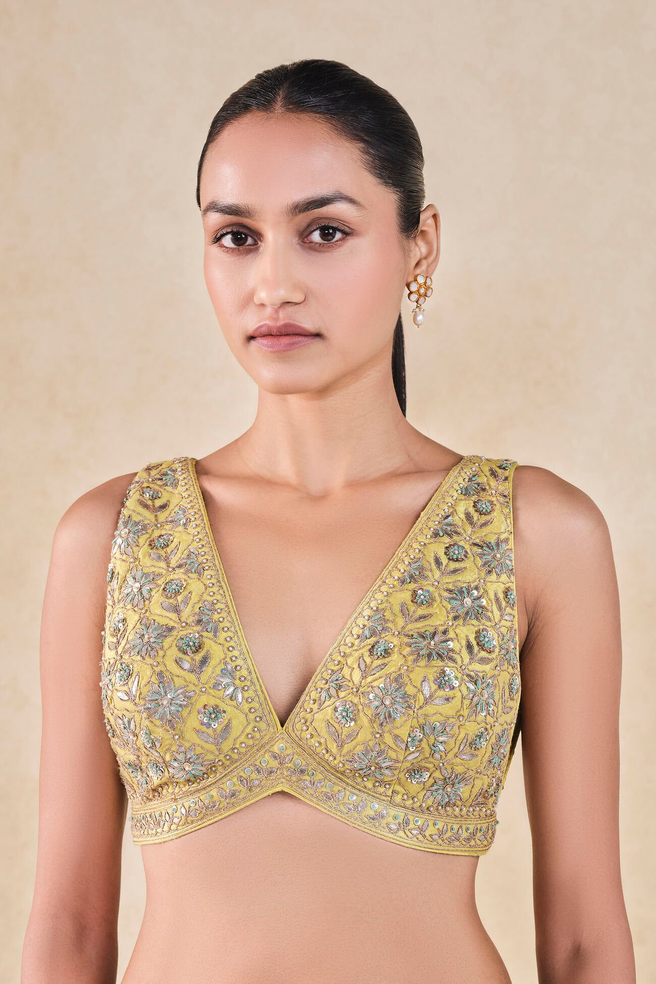 An ethereal and dreamy sleeveless choli in a soft pastel lime hue, perfect for adding a whisper of elegance to your festive drapes.