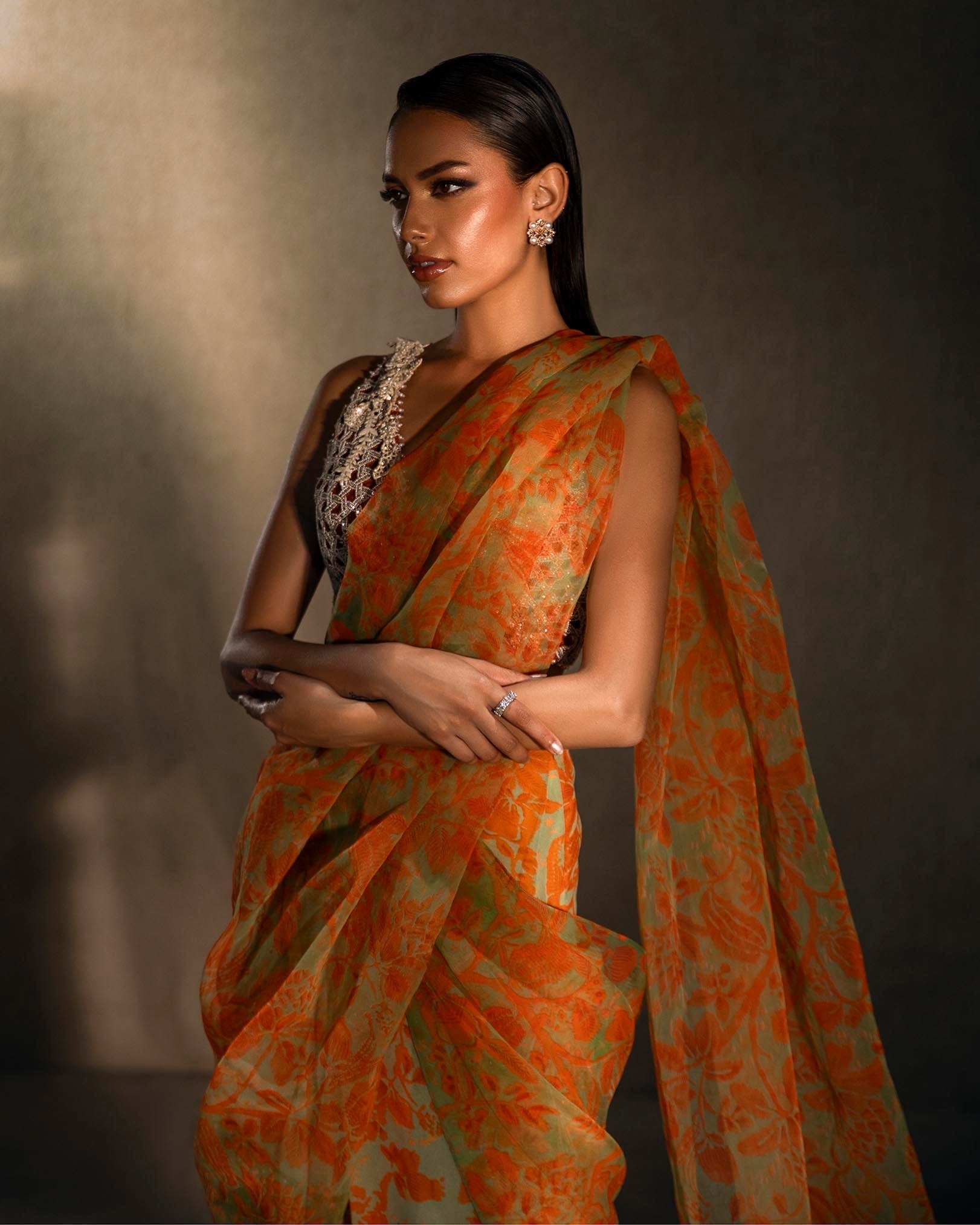 This saree isn’t just a garment, it’s a canvas where tradition meets contemporary charm, where every hue tells a story and every fold whispers grace. The vibrant orange plays with the light, radiating warmth and confidence, while the intricate patterns add depth and character, making it as versatile as it is captivating.