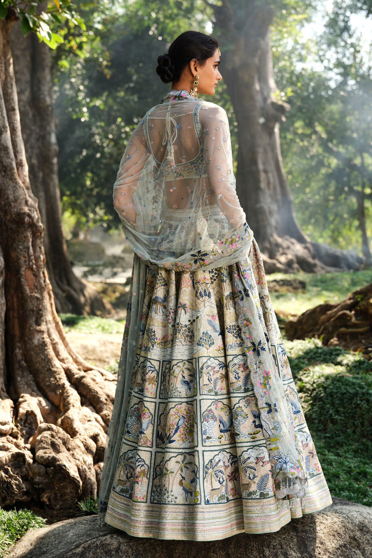 Our Woodelia lehenga is a breathtaking ode to the enchanting beauty of flora and fauna, delicately brought to life on a canvas of luxurious silk.